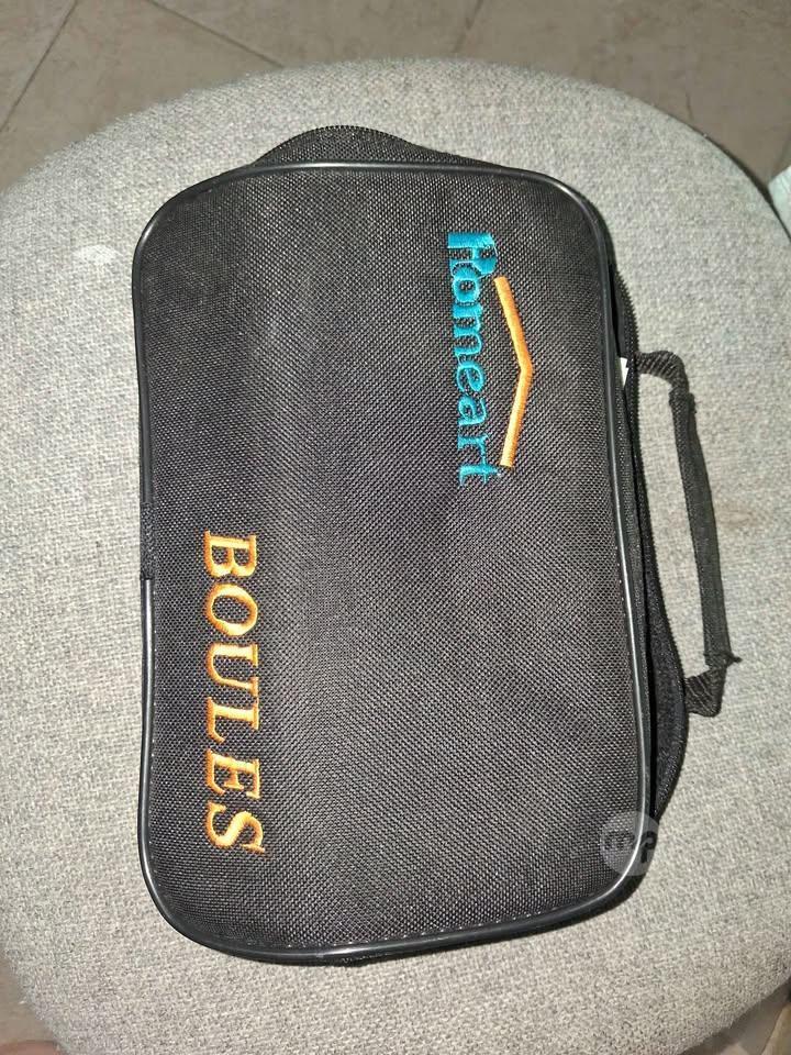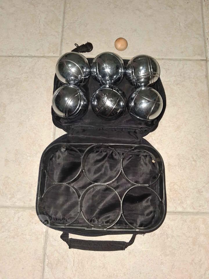 6 metal boules, 1 wooden jack, measuring string, zip carry case (Zip missing from the bag), instruction leaflet