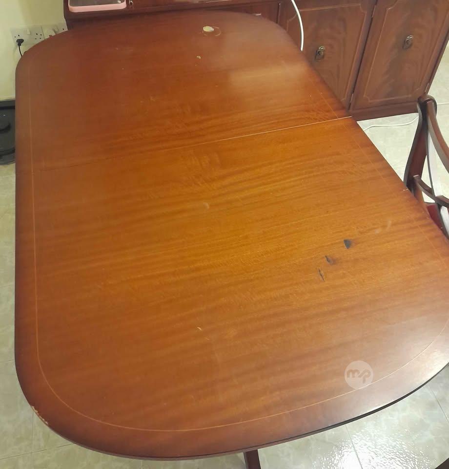 Table has wear and tear and burn marks. The Table is Extendable. 6 chairs in bordeaux colour. 2 chairs with handles and 4 chairs with handleless design. Chairs are in very good condition.