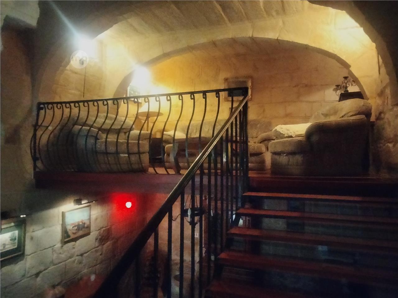 House has a longish hall leading across a roofed interior courtyard with bathroom into the living room and kitchen, above which the sitting room with 3 sofas and TV are connected by means of a wooden staircase.
