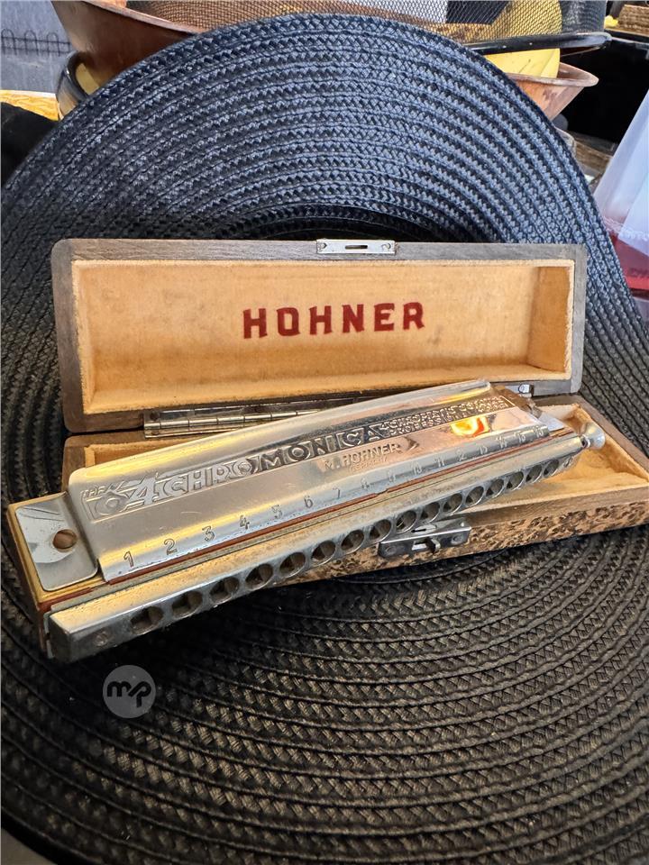 Vintage Hohner Chromonica harmonica, made in Germany, complete with its original wooden presentation case. A classic chromatic harmonica with the iconic slide mechanism, well known for its smooth tone and solid construction.