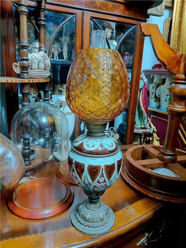 An Antique and unusual Maiollica stand paraffin lamp Complete with original glass yellow globe Still in perfect condition Price of 180 euros