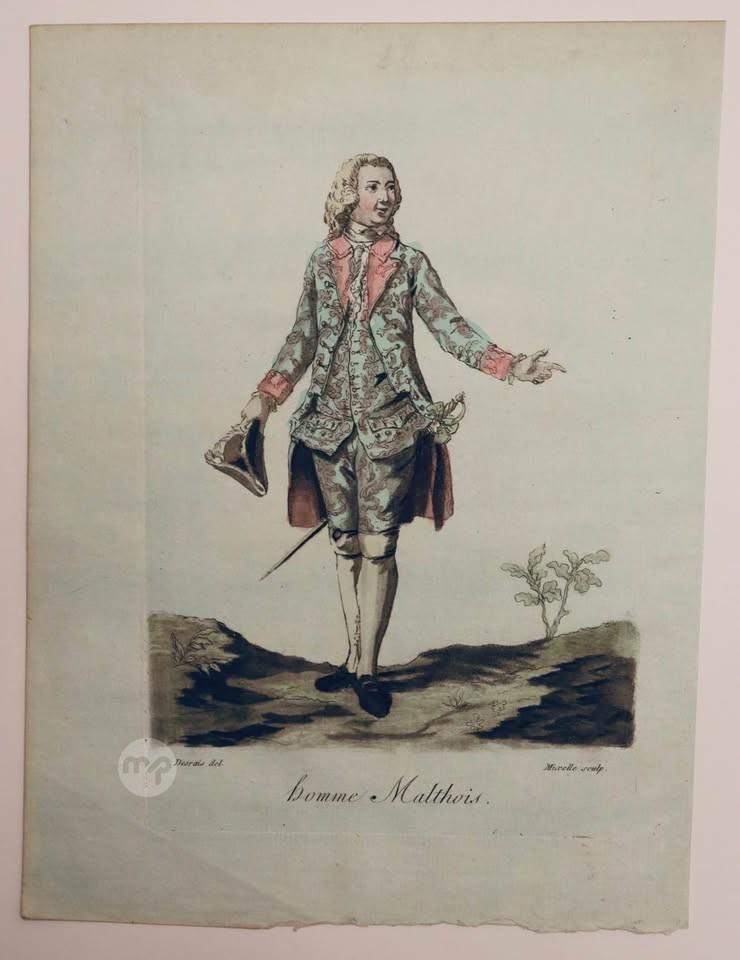 Beautiful original 18th-century engraved and hand-coloured print dated 1788, titled Homme Malthois, showing traditional Maltese dress with exceptional period detail.