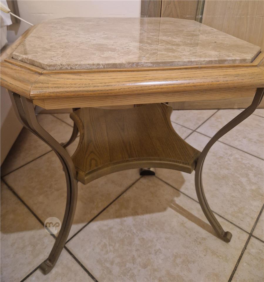 Compact square table featuring a real marble top and sturdy iron legs. Ideal as a side table.