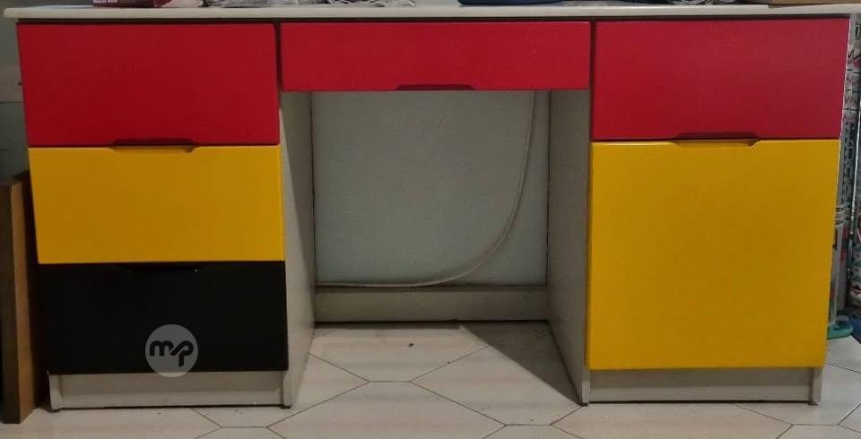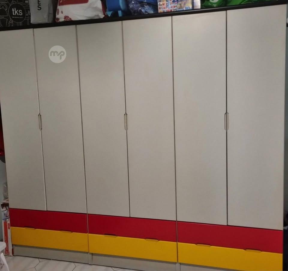 Two Single beds 90cm x 190cm with storage (mattresses not included), wardrobe 240cm x 216cm with a mirror, bed side table, desk with drawers and chair, chest of drawers and four shelves