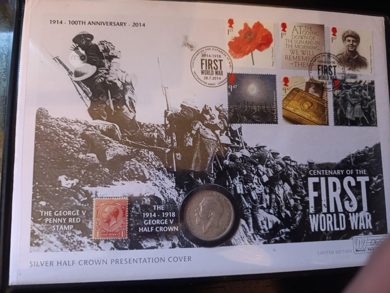 WW1 100th anniversary George V silver crown and George V 1 penny stamp.