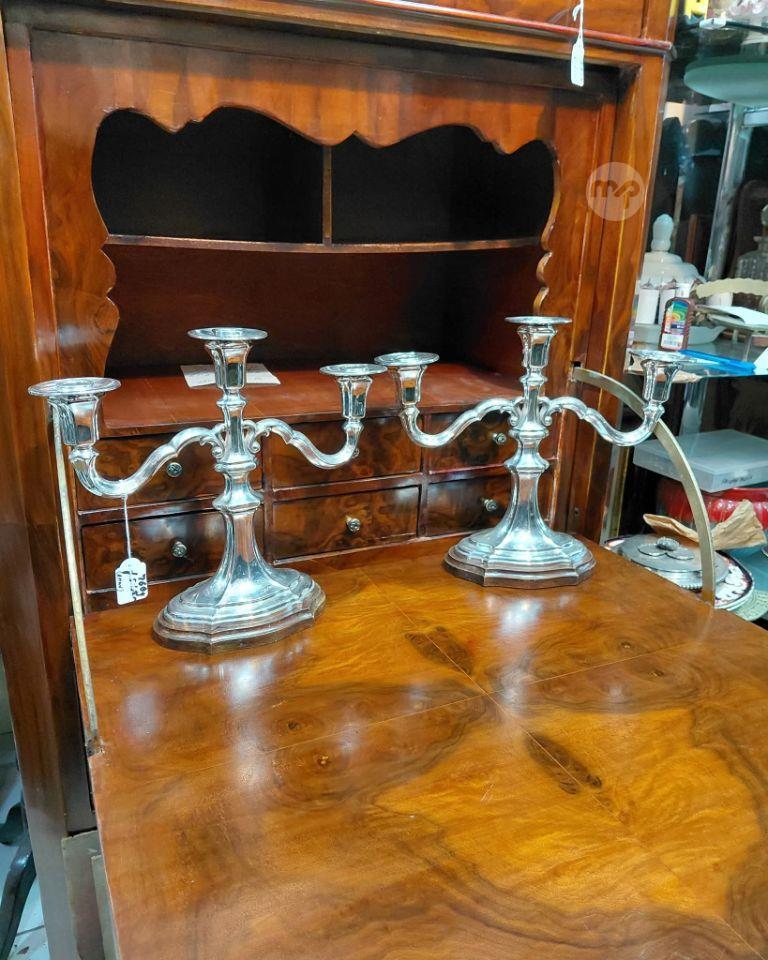 Pair Silver 3 branch candlesticks Mounted on wooden base In perfect condition