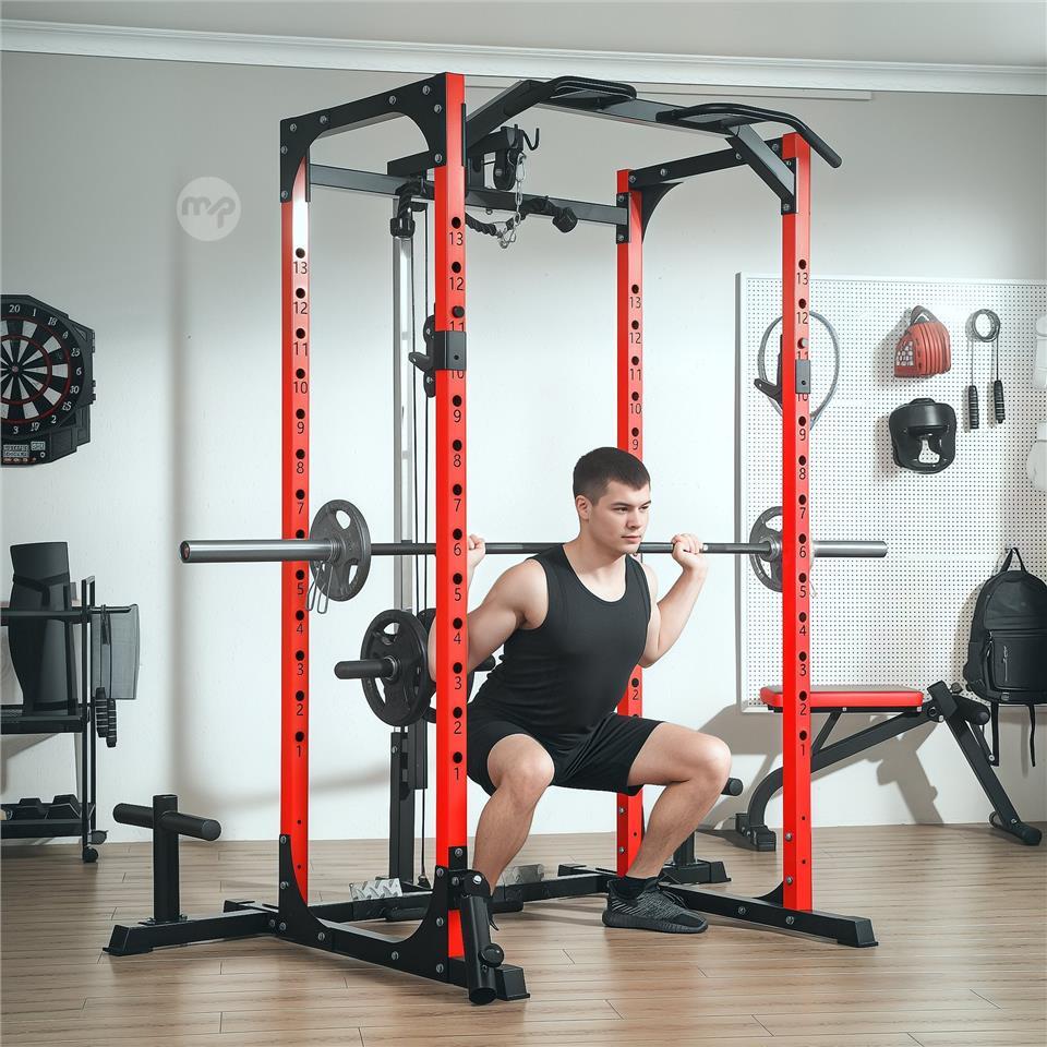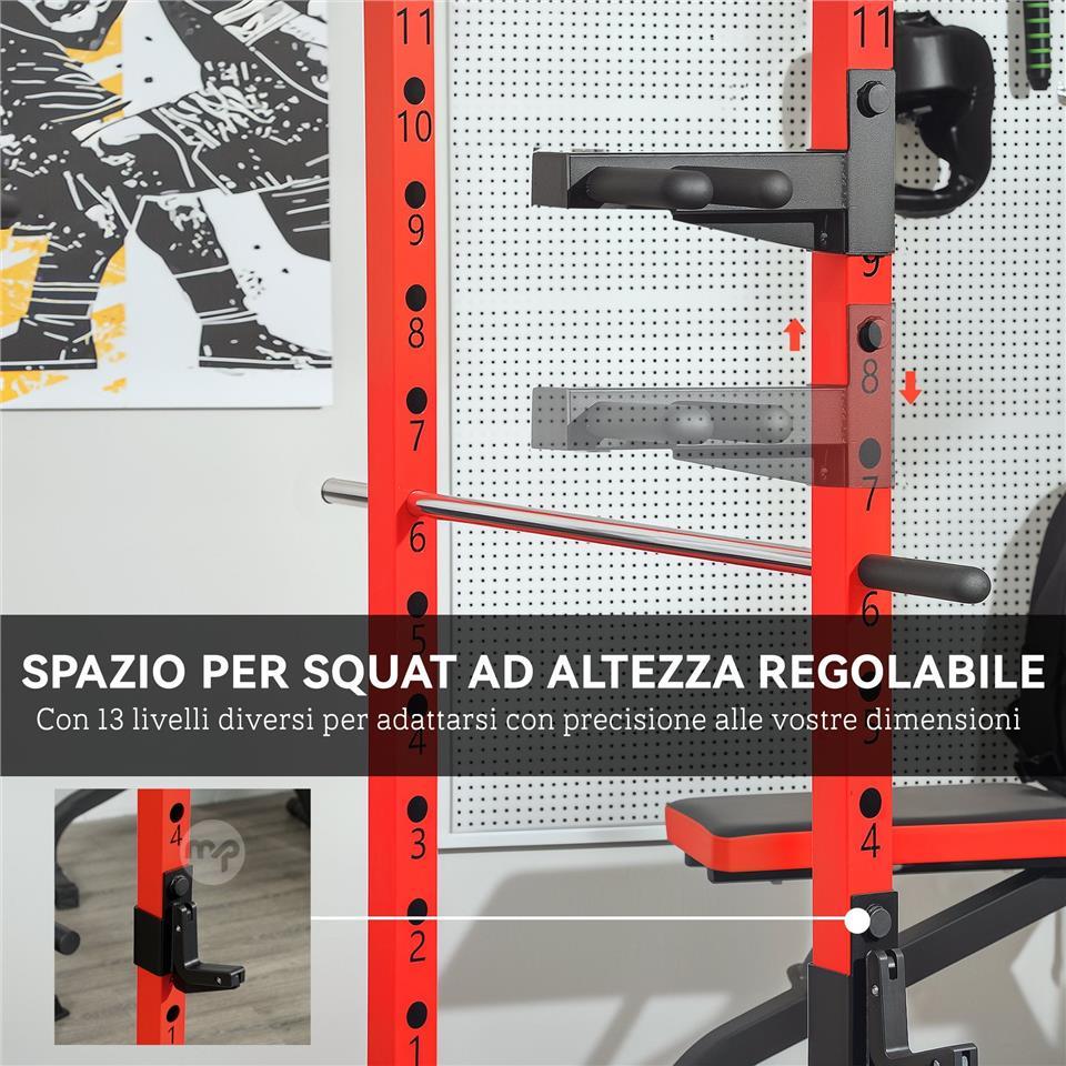 Fitness Station with Barbell Support and Pull-Up and Dip Bar, in Steel, 191x153x205 cm, Red and Black