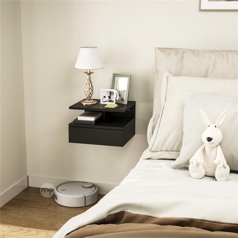 Floating Nightstand for Bedroom with Drawer and Wooden Shelf, 35x32x22.5cm, Black