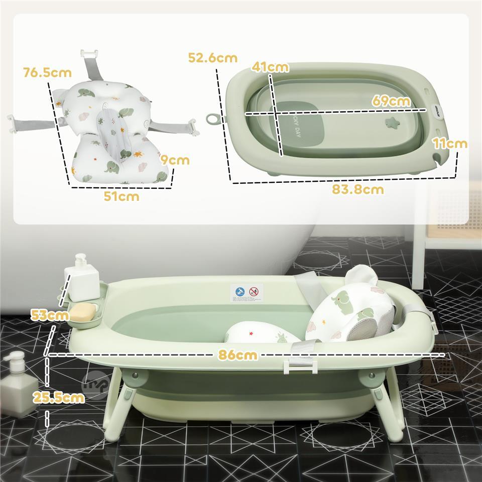 Foldable Baby Bath Tub with Pad and Washbasin, Non-Slip Plastic, 86x53x25.5 cm, Green