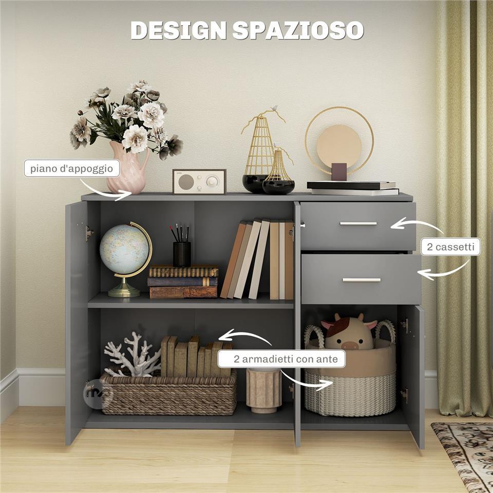 Modern Sideboard with 3 Cabinets and 2 Drawers, Wooden, 106x35x76 cm, Light Grey