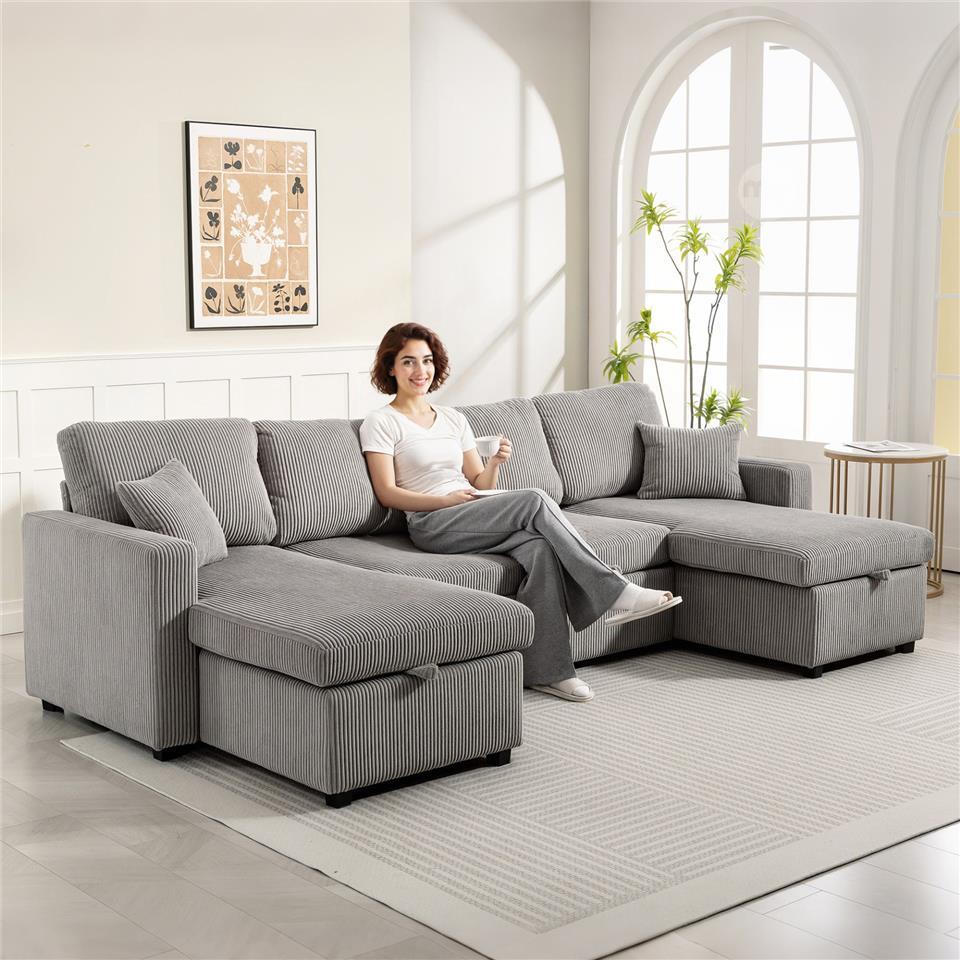 Modern U-Shaped Sofa Bed with 2 Chaise Longues and Storage Compartments, Corduroy, 282x140x86 cm, Grey