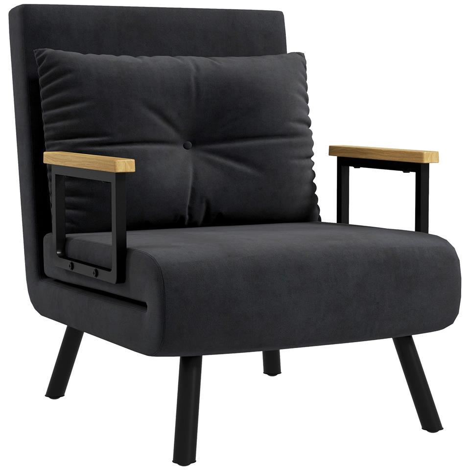 Velvet Black, 3 in 1 Sofa Bed with 5-Position Reclining Backrest and Cushion, 63x73x81 cm, Black