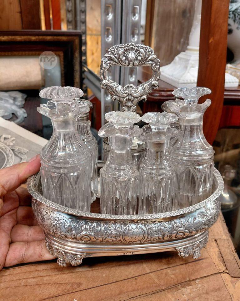 Stands on 4 Decorative feet and houses 7 beautifully cut glass bottles with stoppers/ Silver tops