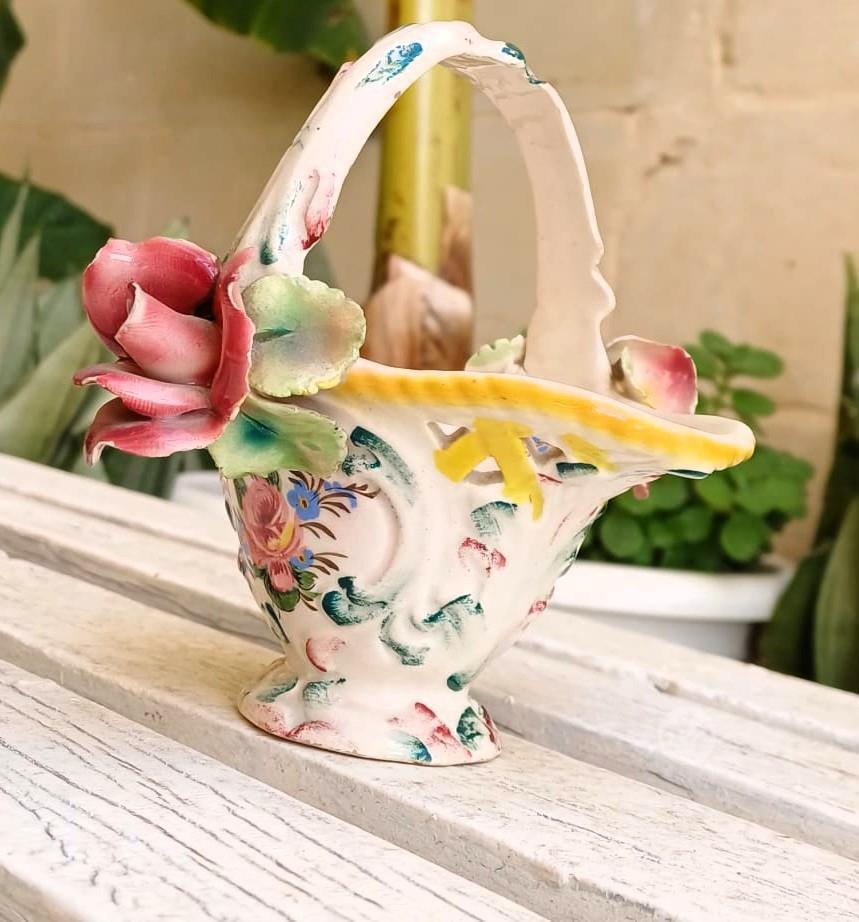 Italian Hand-Painted Ceramic Rose Basket, Capodimonte-Style