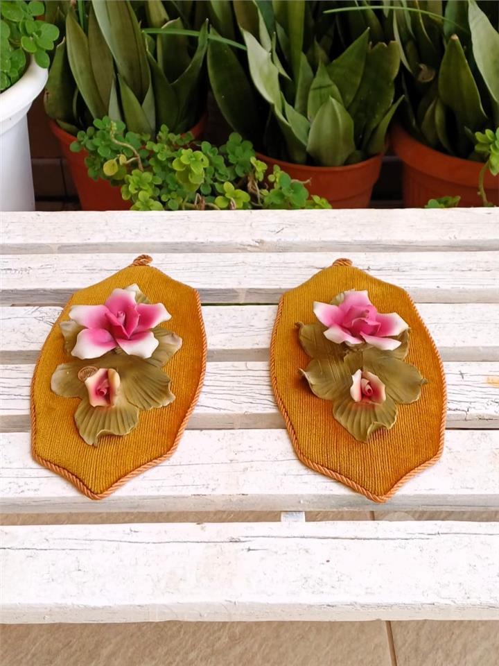Pair of vintage Italian porcelain floral wall plaques featuring raised pink and white flowers with green leaves, mounted on mustard‑gold textured fabric backings with cord hangers. Each plaque showcases hand‑formed petals and leaves in the Capodimonte tradition of applied porcelain flowers, giving a three‑dimensional effect that stands out beautifully against the warm velvet‑style background.