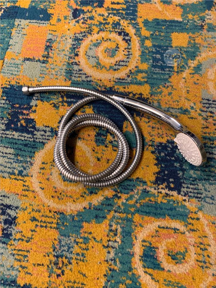Chrome handheld shower head with matching flexible metal hose. Suitable for bathrooms, guest rooms, rental properties, or replacements. Clean and functional.