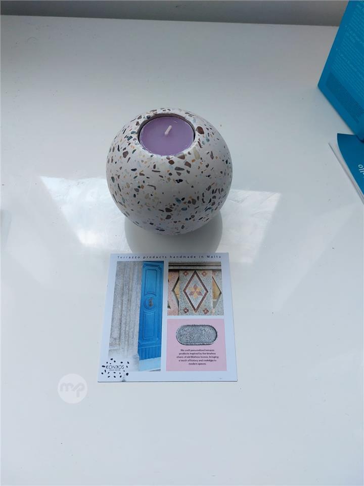 Beautiful handmade terrazzo candle holder, crafted with a smooth spherical design and a unique multicolour stone pattern. Each piece is individually made, meaning no two are exactly the same.