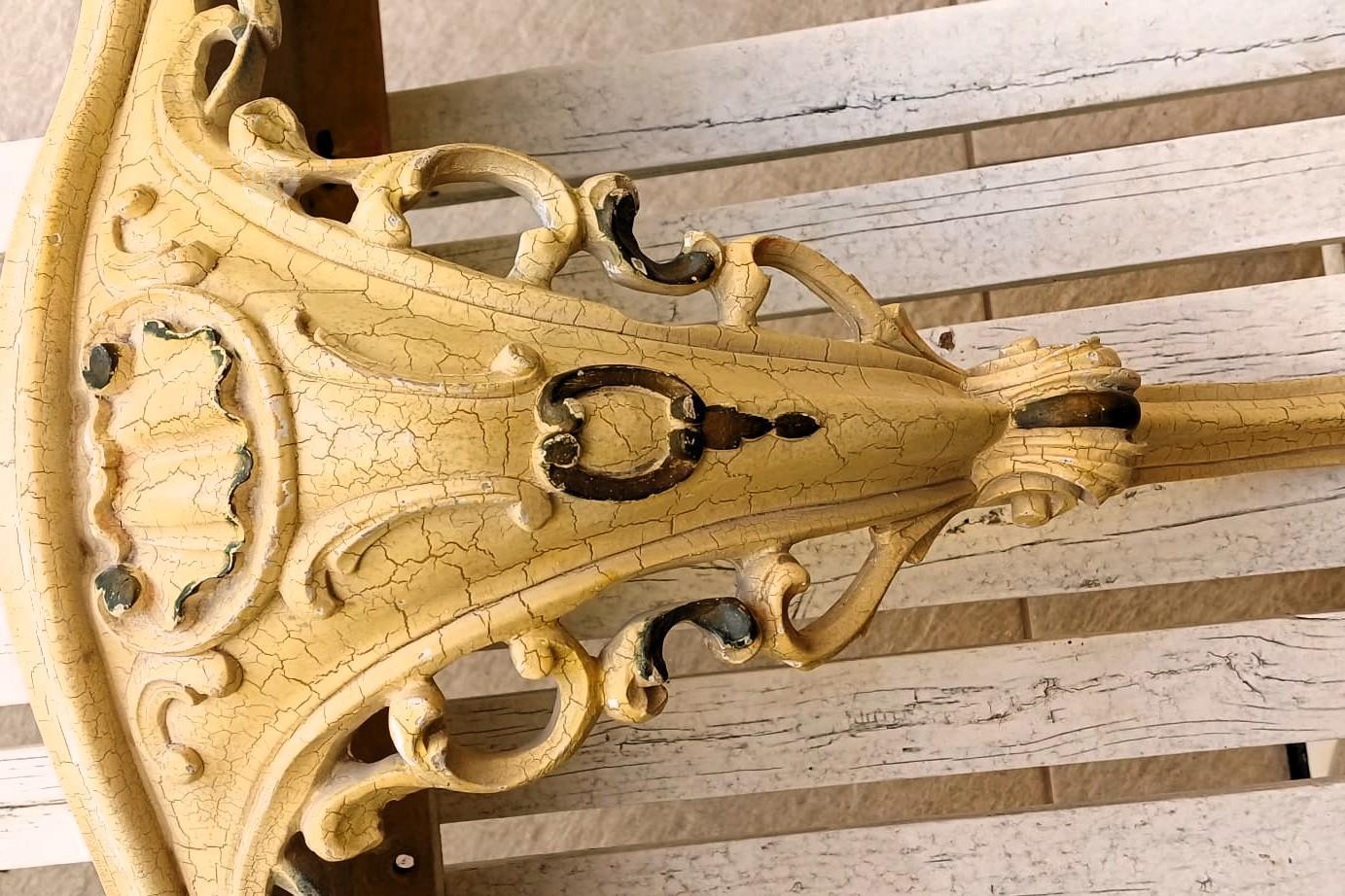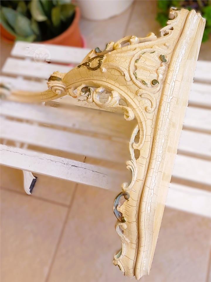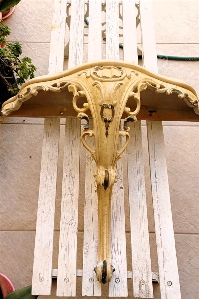 Vintage wall-mounted console table. Distressed Cream & Gold colour. Rococo Revival style. Featuring a classic Demi-Lune shape, this piece is heavily inspired by French Rococo and Baroque design, characterized by its fluid curves, elegant scrolls, and intricate shell motifs. The piece features a beautiful authentic crackle-glaze finish in a creamy off-white, accented with hand-painted gold and dark patina highlights that emphasize the ornate carvings.