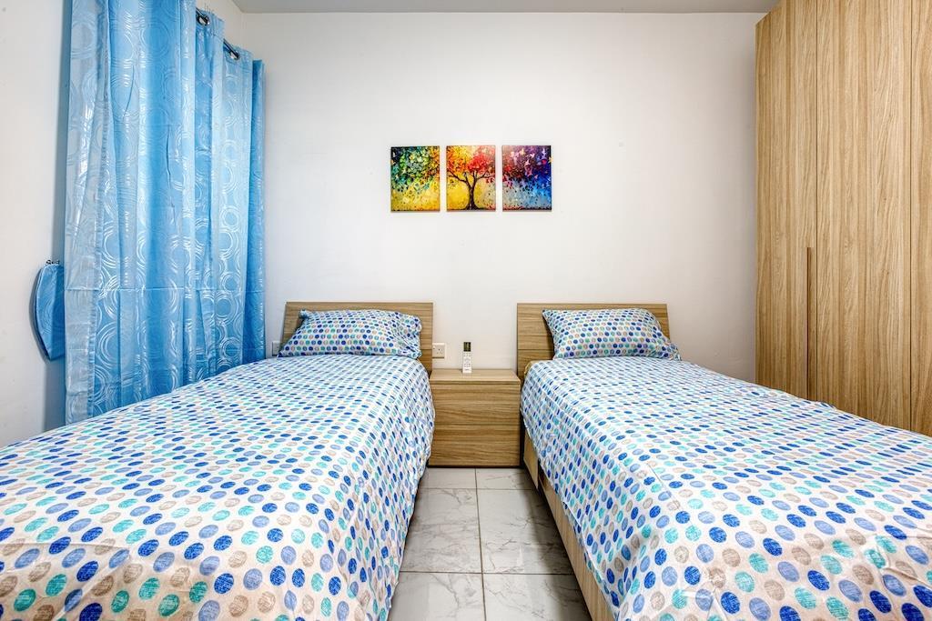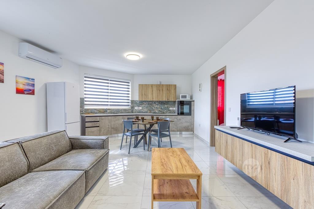 2 bedroom corner elevated maisonette full of natural light in a quiet area at St Peter's, Zabbar facing ODZ. Property is close to all amenities and minutes away from Smart City. This charming property in a squarish layout consists of one main bedroom with walk in wardrobe and ensuite shower, one bedroom with two single beds, a bathroom and a kitchen/living/dining area. A large outdoor area makes this property truly unique. Property is fully air conditioned, furnished, and includes dishwasher, microwave, washing machine and tv.