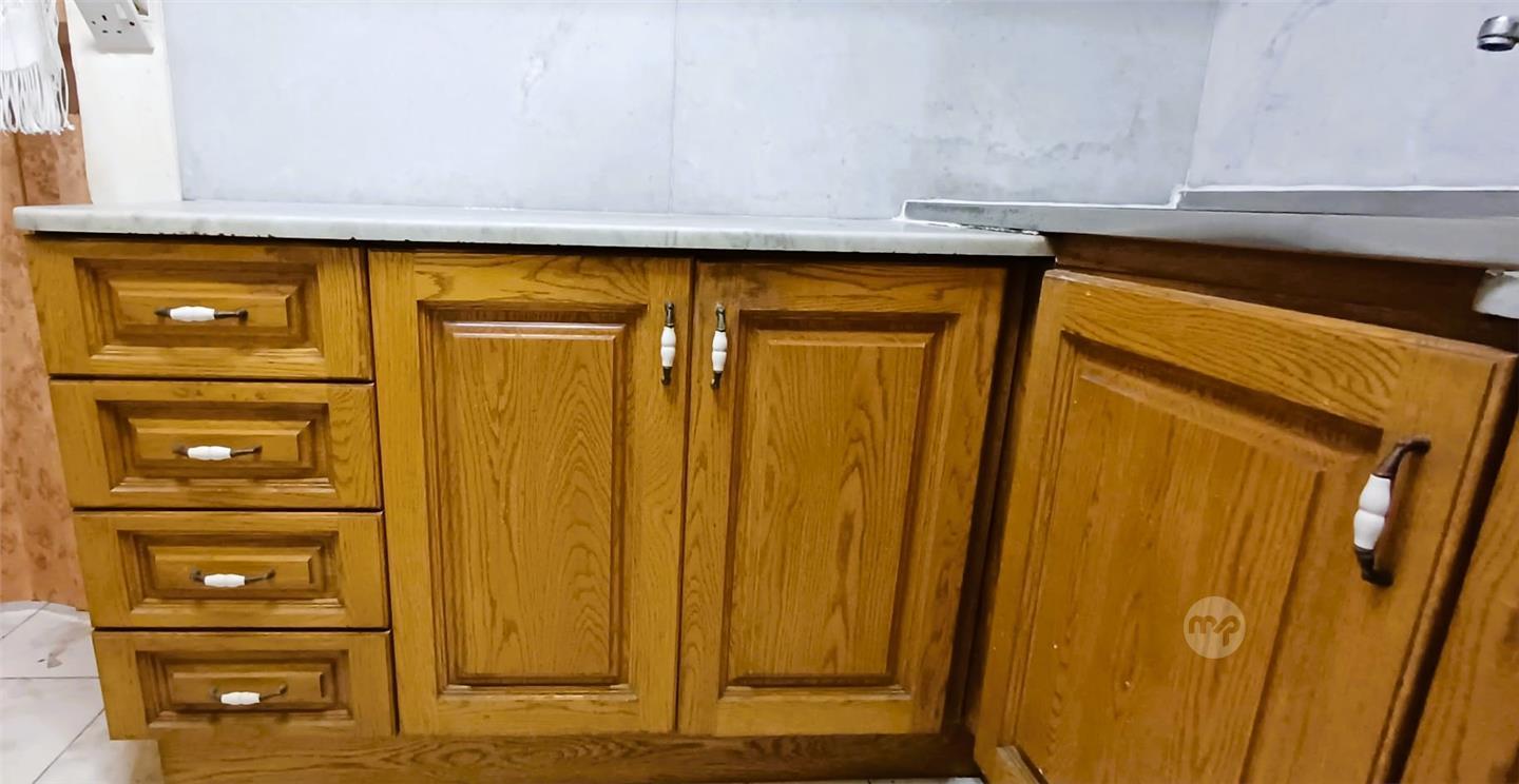 High-quality L-shaped kitchen set made from solid wood, featuring carrara marble countertops and a full-height marble backsplash. Classic honey-gold finish with raised panel style. Full height backsplash cover bottom to top cupboards. The countertop has a bullnose (rounded) edge, perfect in terms of safety and to prevent chipping. The top cupboard includes a built-in wooden plate draining rack. The sink is a single-bowl stainless steel unit with a large draining board. Used but in good condition and well-maintained.
