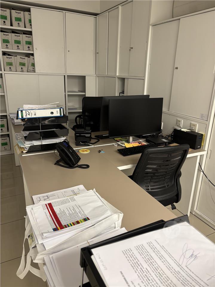 Office cabinetry customised to cover floor to ceiling storage all with lock and key, including an executive desk with executive chair, a board room table with 7 chairs, 4 L-Shaped workstations and 4 office chairs. Can be sold in segments.