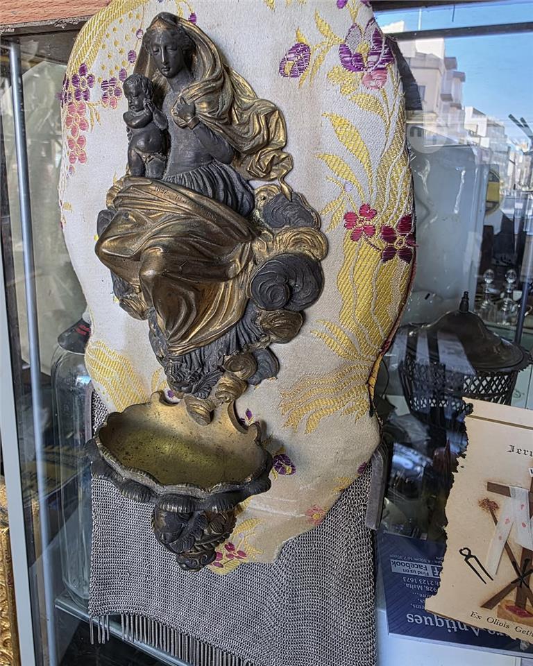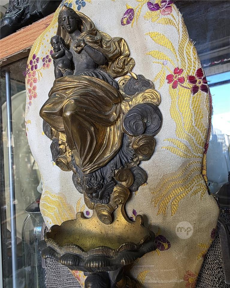 A Beautiful Antique Holy water font, Cast in bronze,dark patina and gilt accents . Depicting the Virgin Mary holding the Baby Jesus. Mounted on an embroidered textile back. Measures 32 x 19 cms Pric