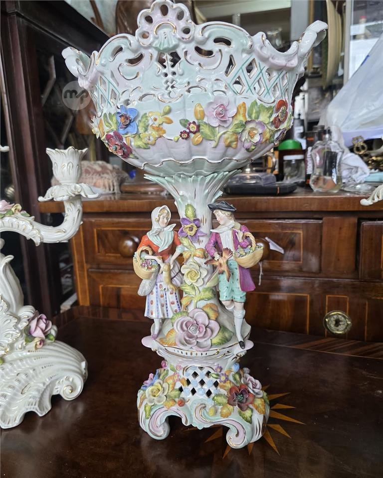 A Large Three piece ,Dresden-style, German porcelain central pedestal bowl and a pair of matching three- branch candelabras.