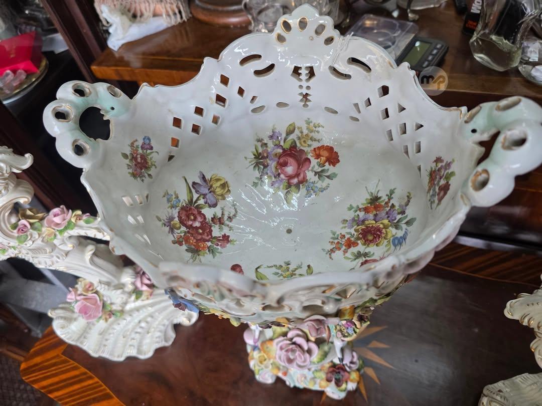 A Large Three piece ,Dresden-style, German porcelain central pedestal bowl and a pair of matching three- branch candelabras. These feature ornate rococo designs with applied flowers and figural moun