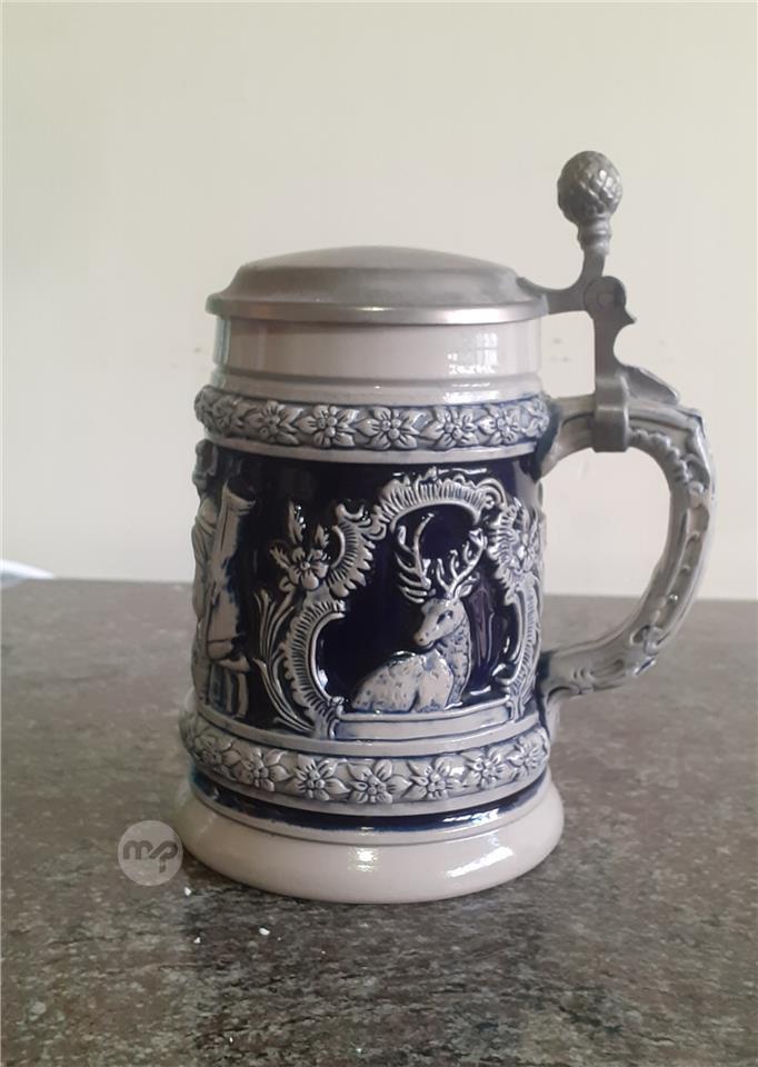 German ceramic beer stein with a pewter lid.