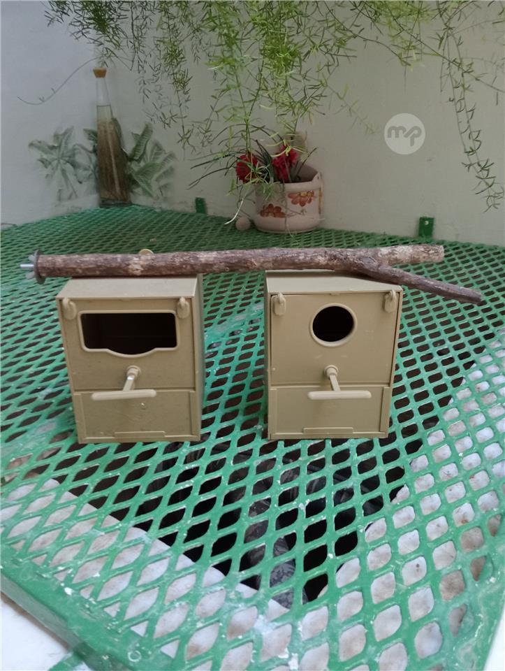 2 Plastic Budgie nest boxes and wood perch with screw
