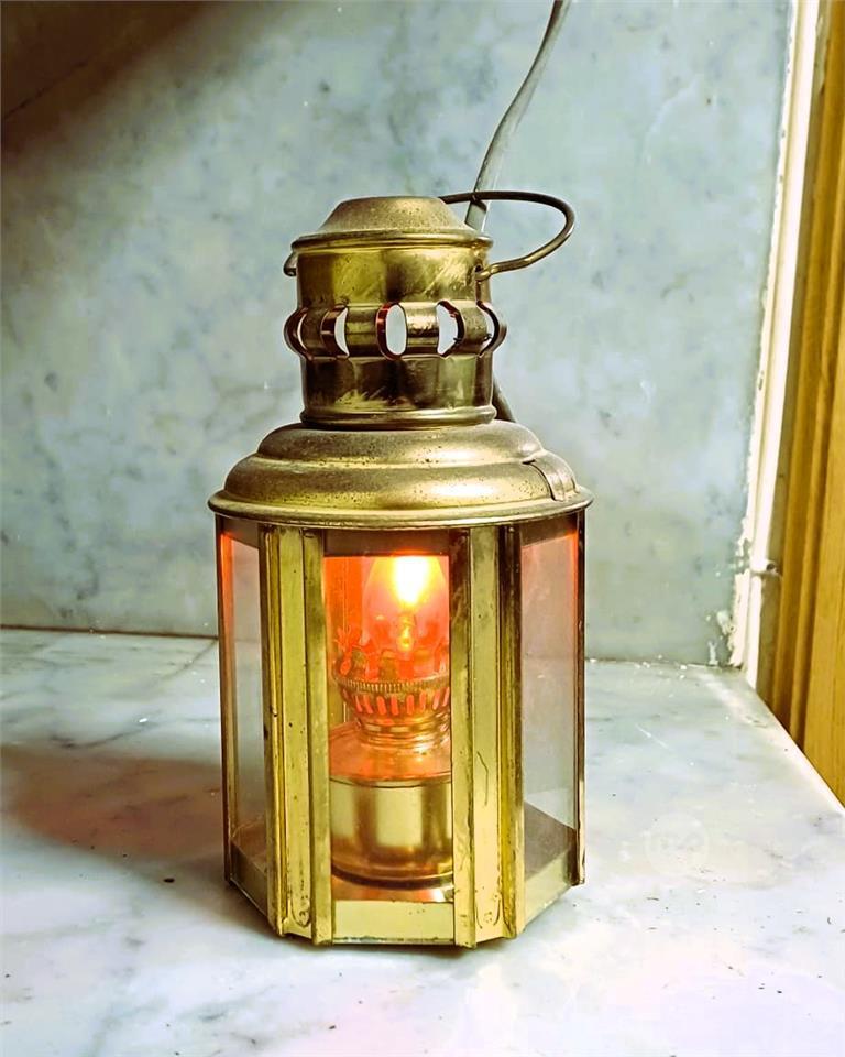 Vintage-style nautical lantern with polished brass. The main body features a hexagonal frame with clear glass panels with flickering bulb. Comes wired with a 3 pin plug.