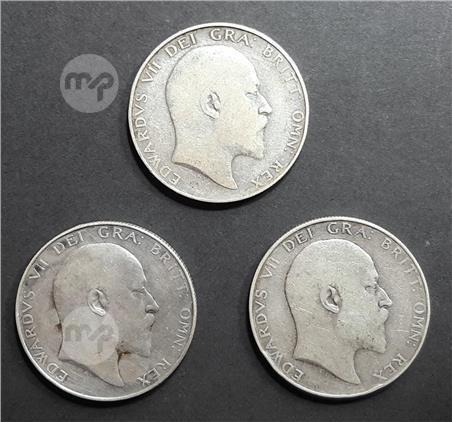 3 KING EDWARD VII STERLING SILVER (.925) HALF CROWN COINS dated 1907, 1909 and 1910