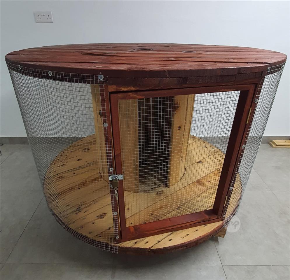 Custom cage painted with highly water repellent paint and having a diameter of 4.5ft. Large door with lock. Feeding tubes also included with the cage.