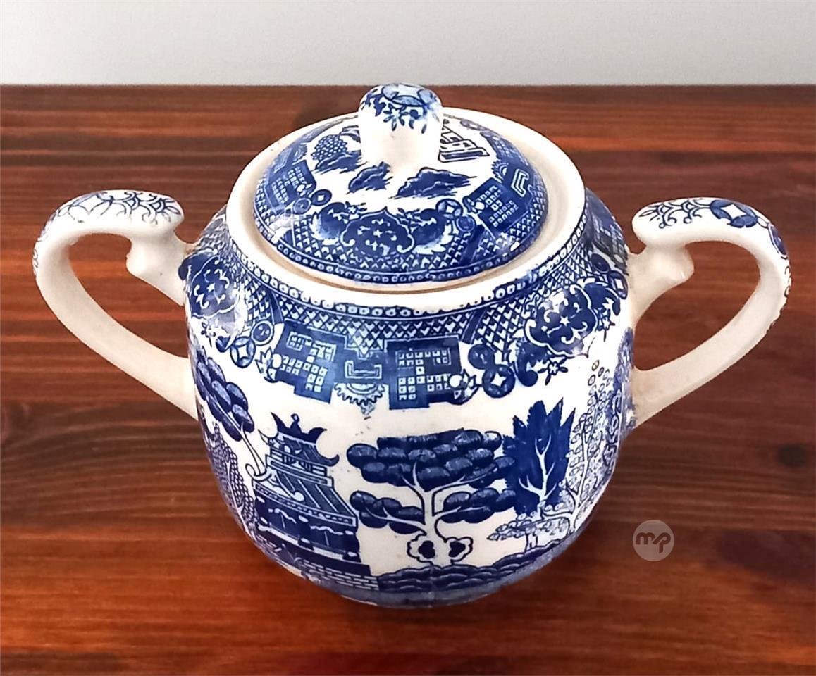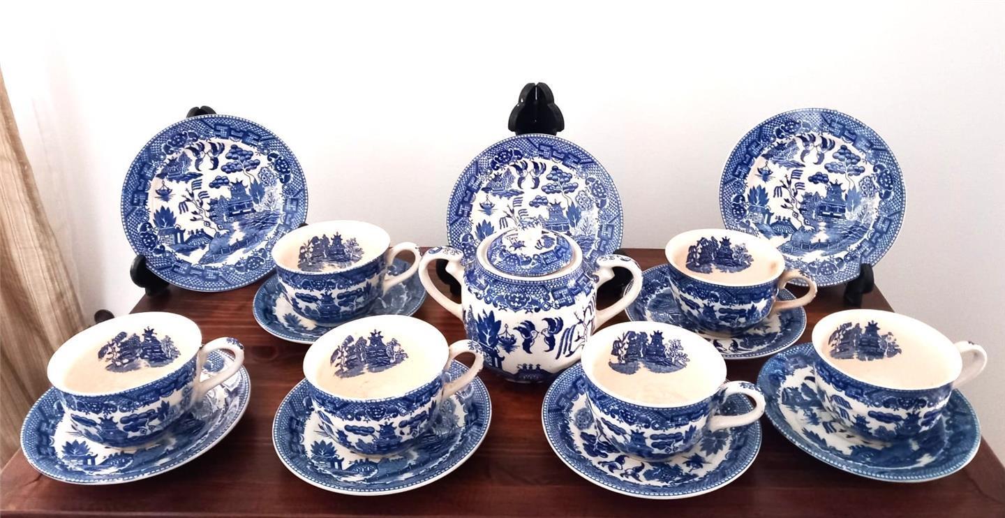 VINTAGE WILLOW PATTERN 6 CUPS, 6 SAUCERS, 3 SIDE PLATES and SUGAR BOWL