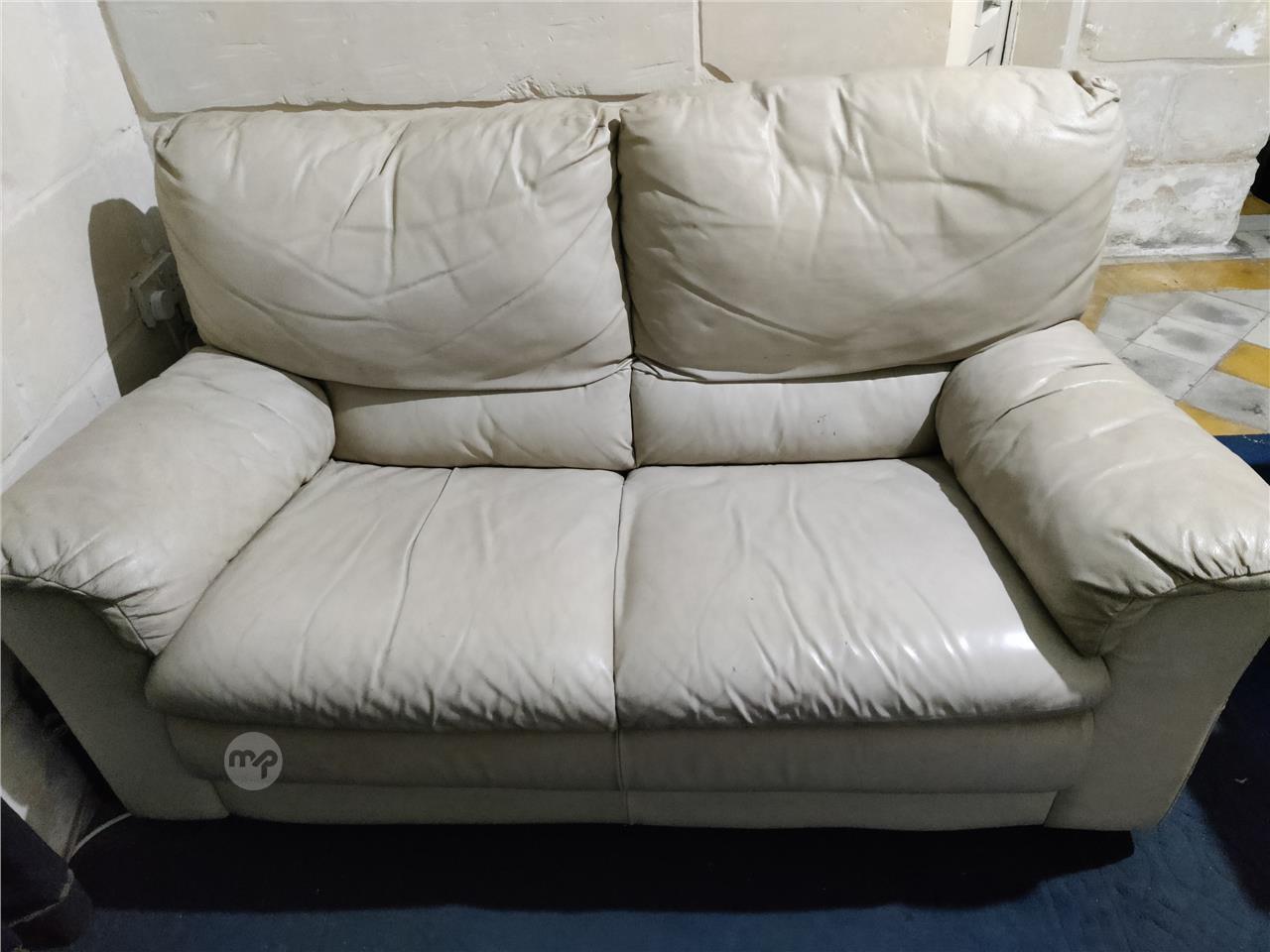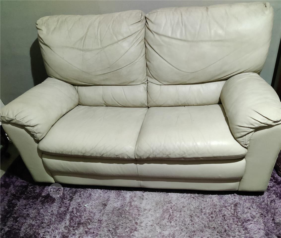A pair of comfortable leather sofas in neutral cream colour. Soft cushions, sturdy frame, and ideal for living room, flat, or rental property. Shows normal wear for their age but still very usable and comfortable.