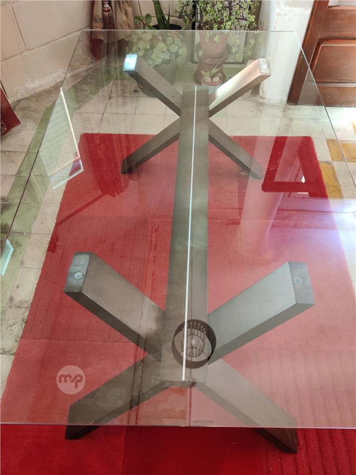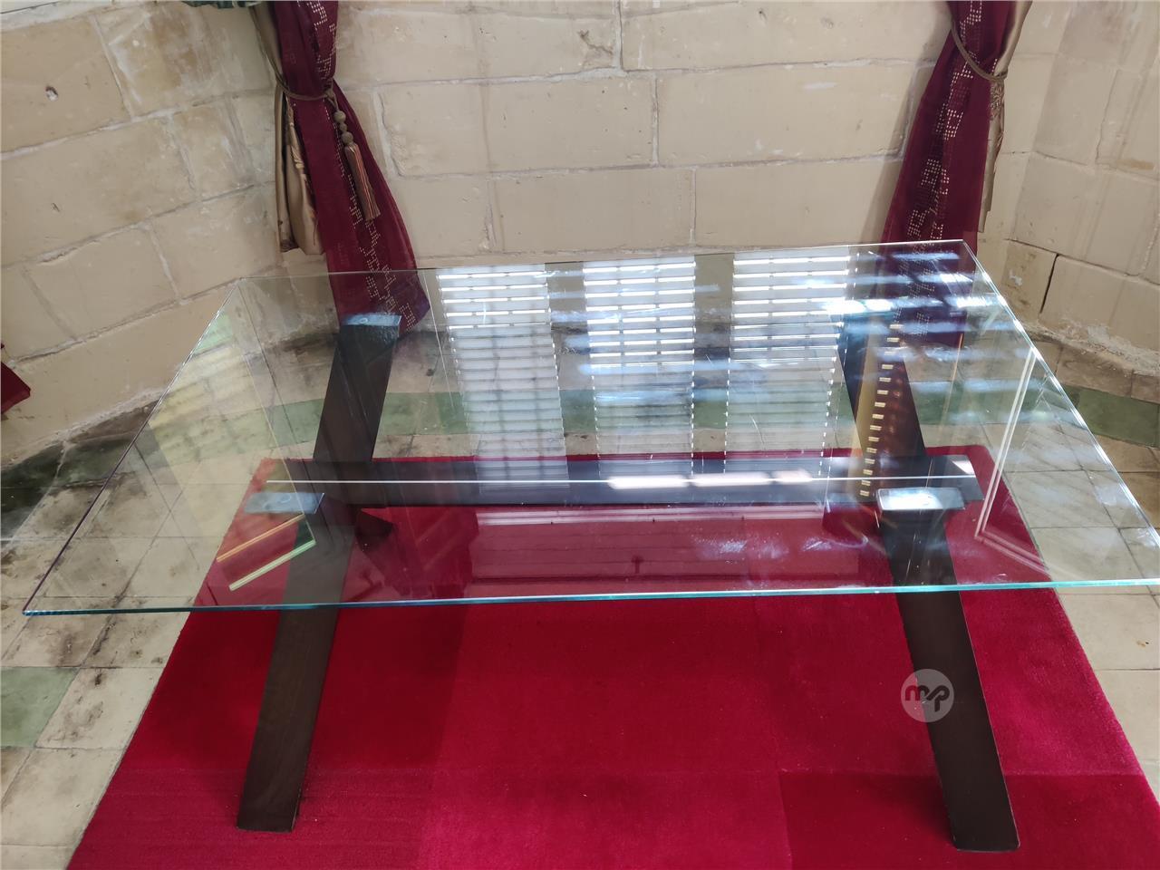 Modern rectangular glass table with solid dark wood base and cross‑leg design. Thick glass top and very sturdy structure. Clean, elegant look — ideal for dining room or office.