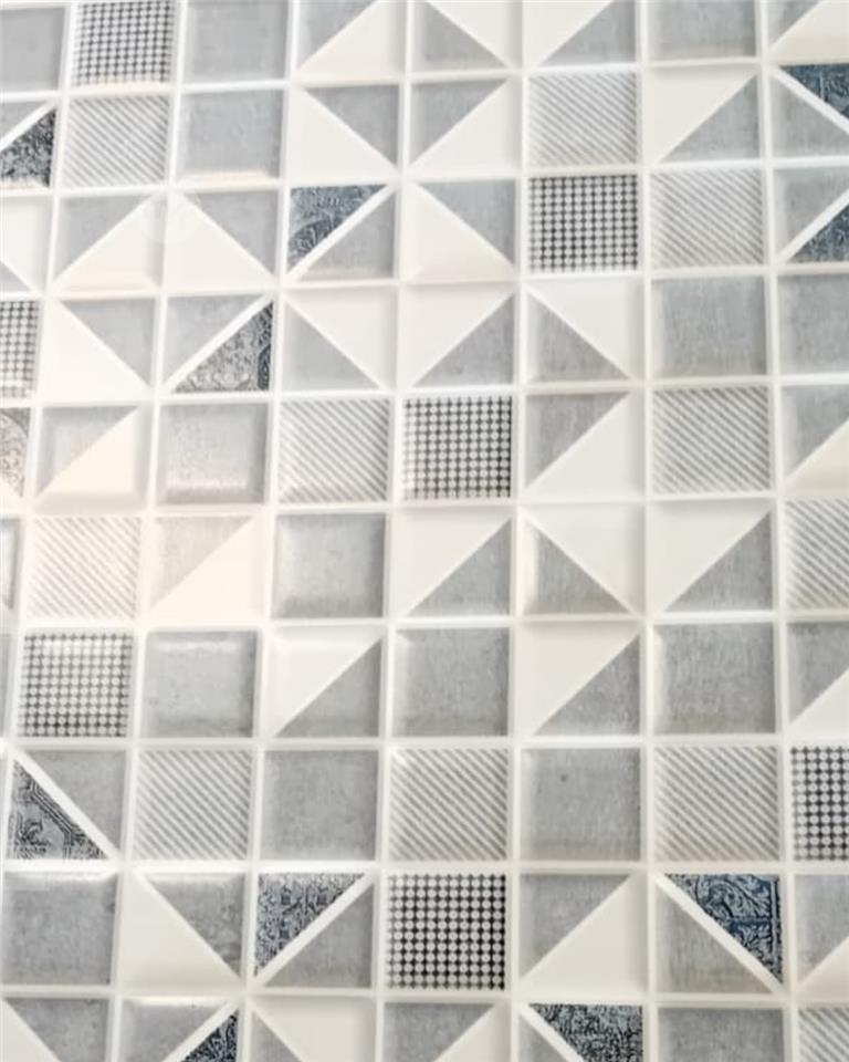 Modern porcelain tile featuring raised triangular and square blocks in soft grey-white tones mixed with subtle patterned inserts (fine checks, stripes, and delicate motifs). The 3D faceted surface creates gentle shadows and light play, adding depth and contemporary interest while keeping a calm, versatile neutral palette – perfect for accent walls, bathroom feature areas, kitchen backsplashes or any space wanting quiet movement and refined texture.