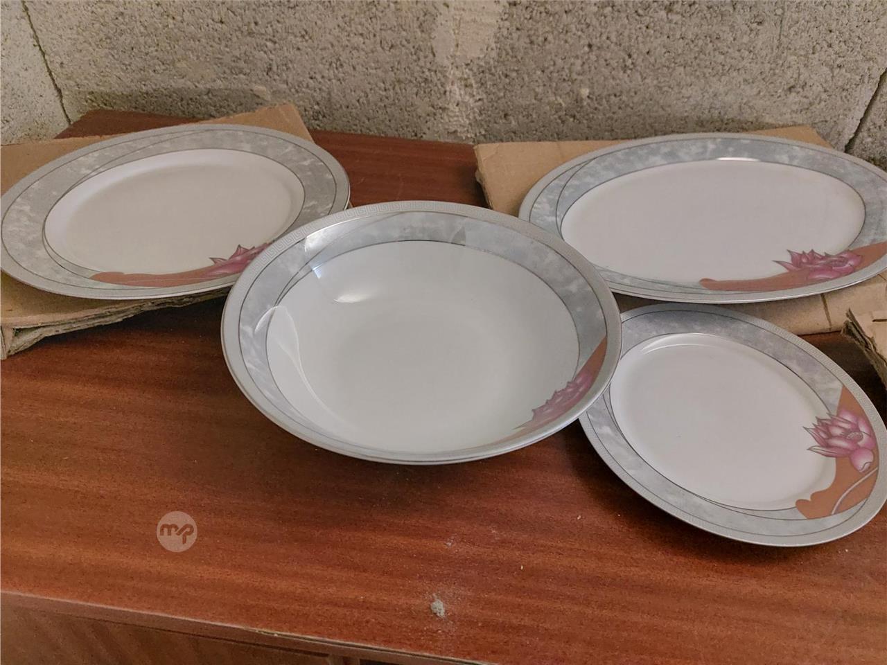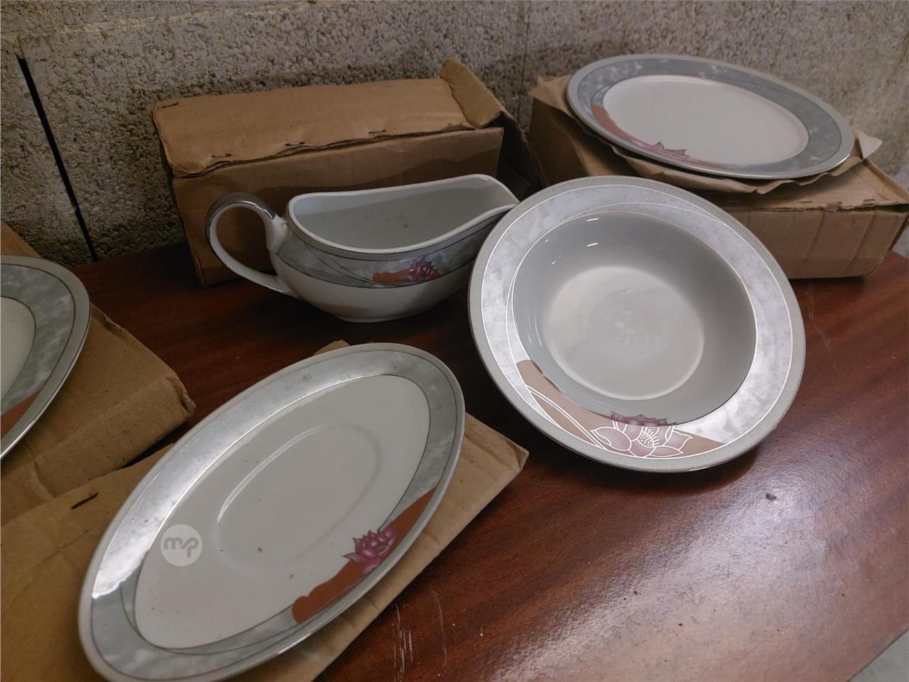 12 normal plates; 1 large plate, 1 tea pot, 11 deep plates, 12 small plates, 1 bowl, 1 large oval plate, 1 small oval plate.
