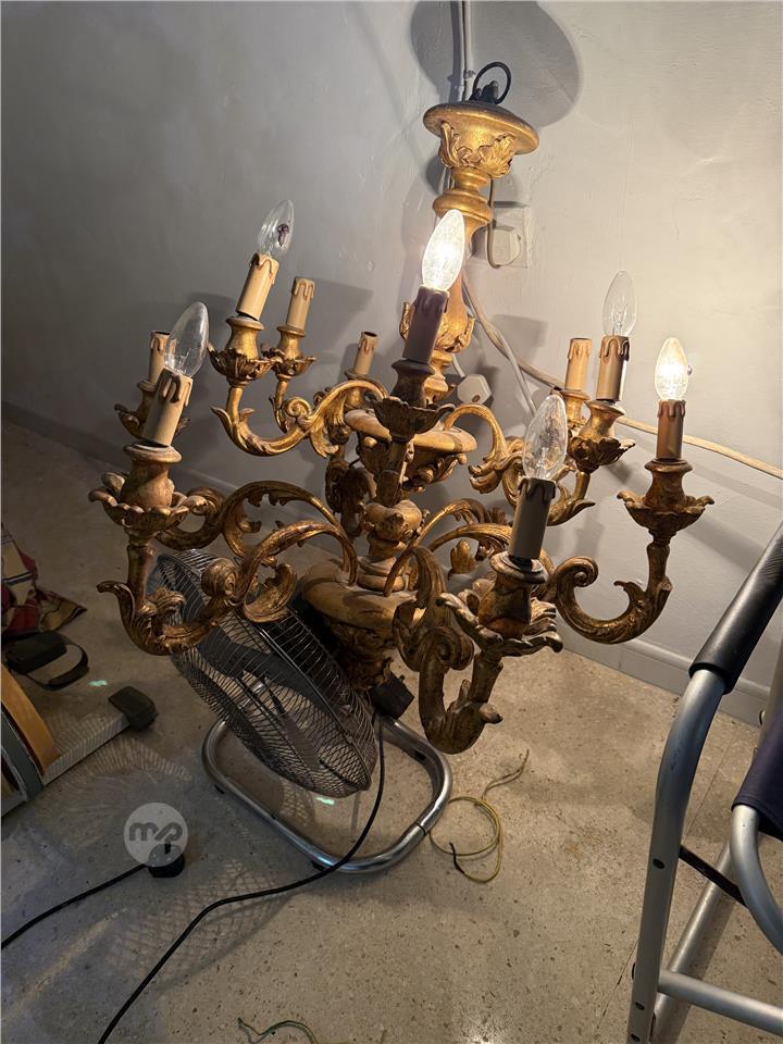 Chandelier vintage beautiful carved wood with gold gilt finish in very good condition with 2 layers of lights . Great statement piece
