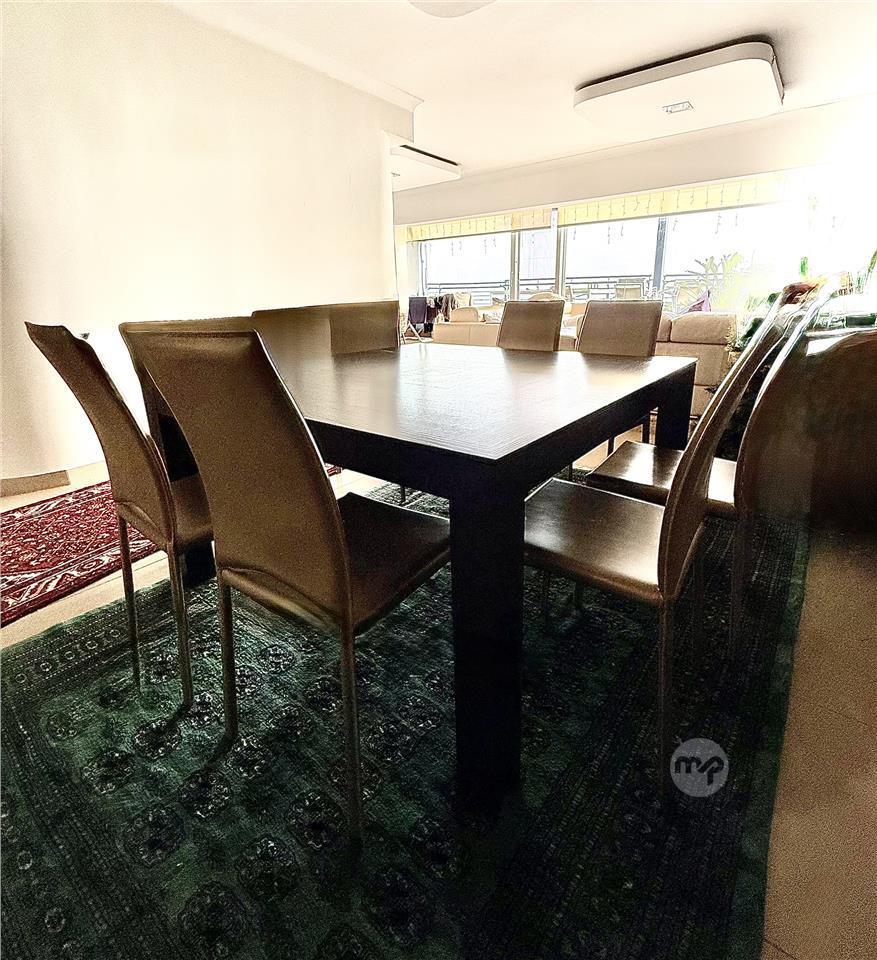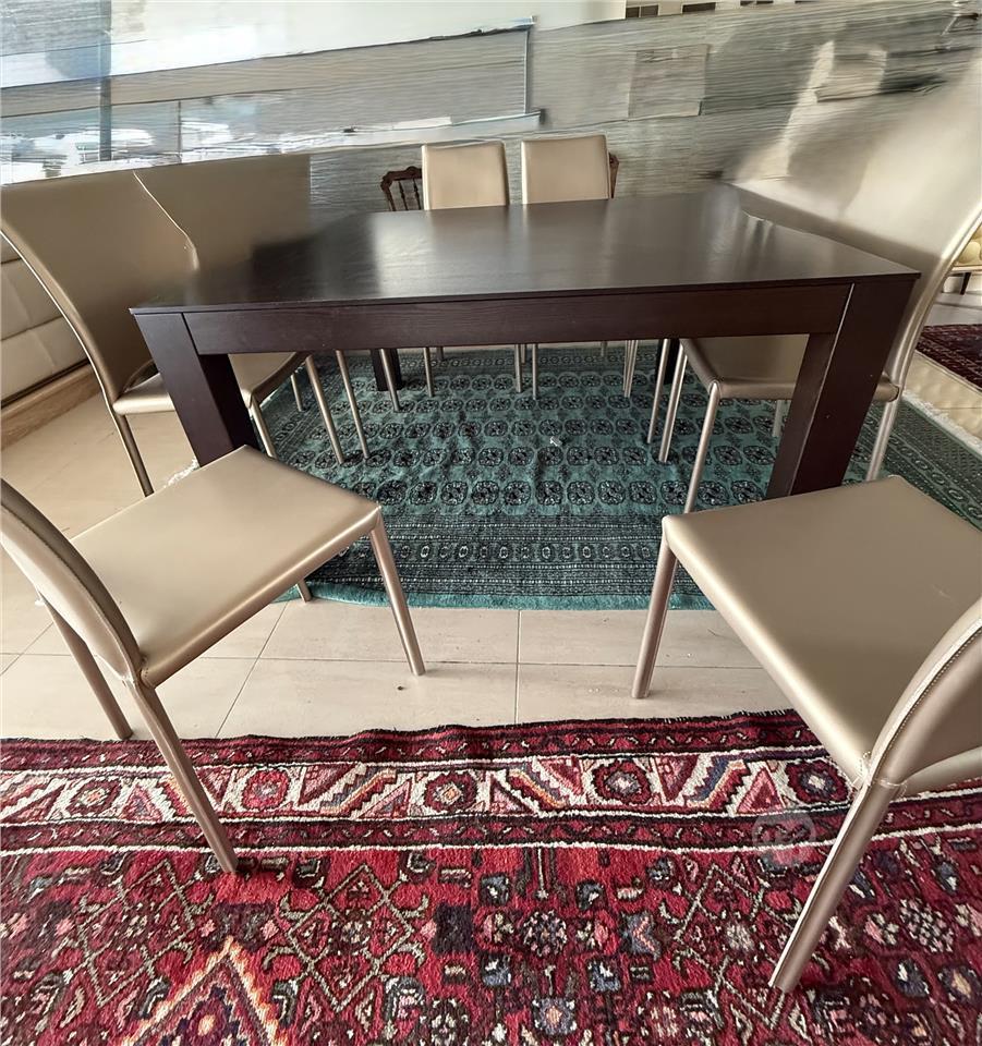 Modern Dining table square 140 x 140cm in venghe solid wood and 8 chairs in gold colour leather . Excellent condition and would be really nice in a modern home