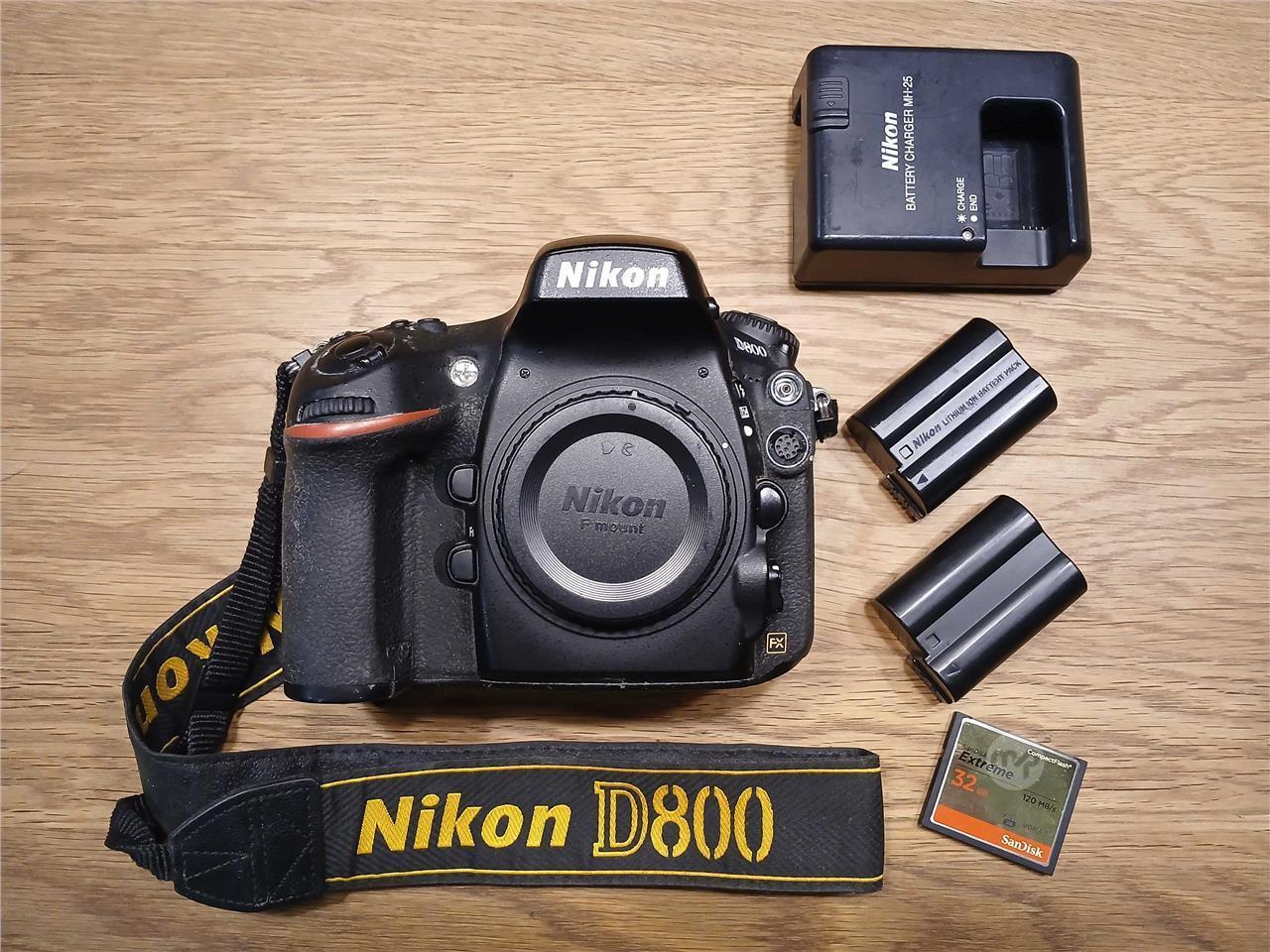 Nikon D800 DSLR Camera, low shutter count, with 2x batteries and charger, including Sandisk 32GB Extreme Card. Good condition.
