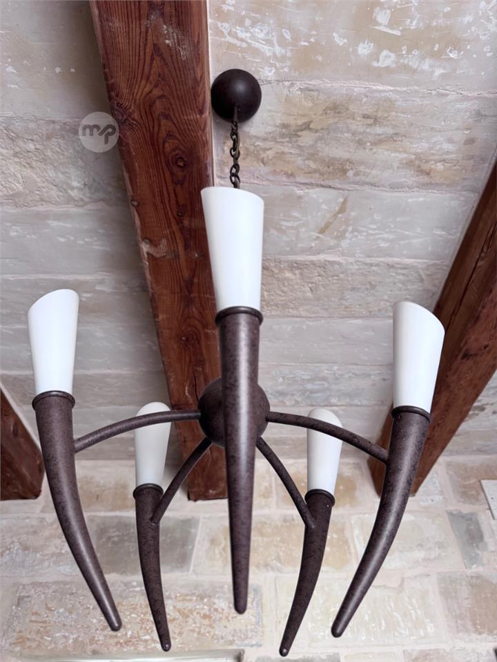 Pendant light with five arms, rust colour metal and frosted glass (with 2 spares).