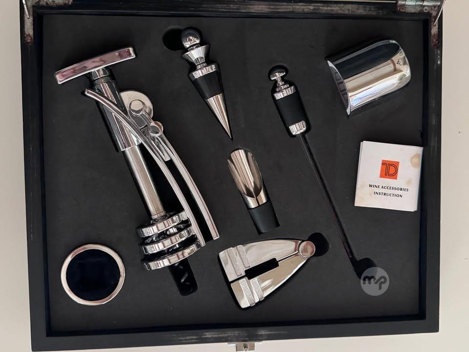Never used - 7 pieces of wine accessories in stainless steel, presented in a wooden black box.