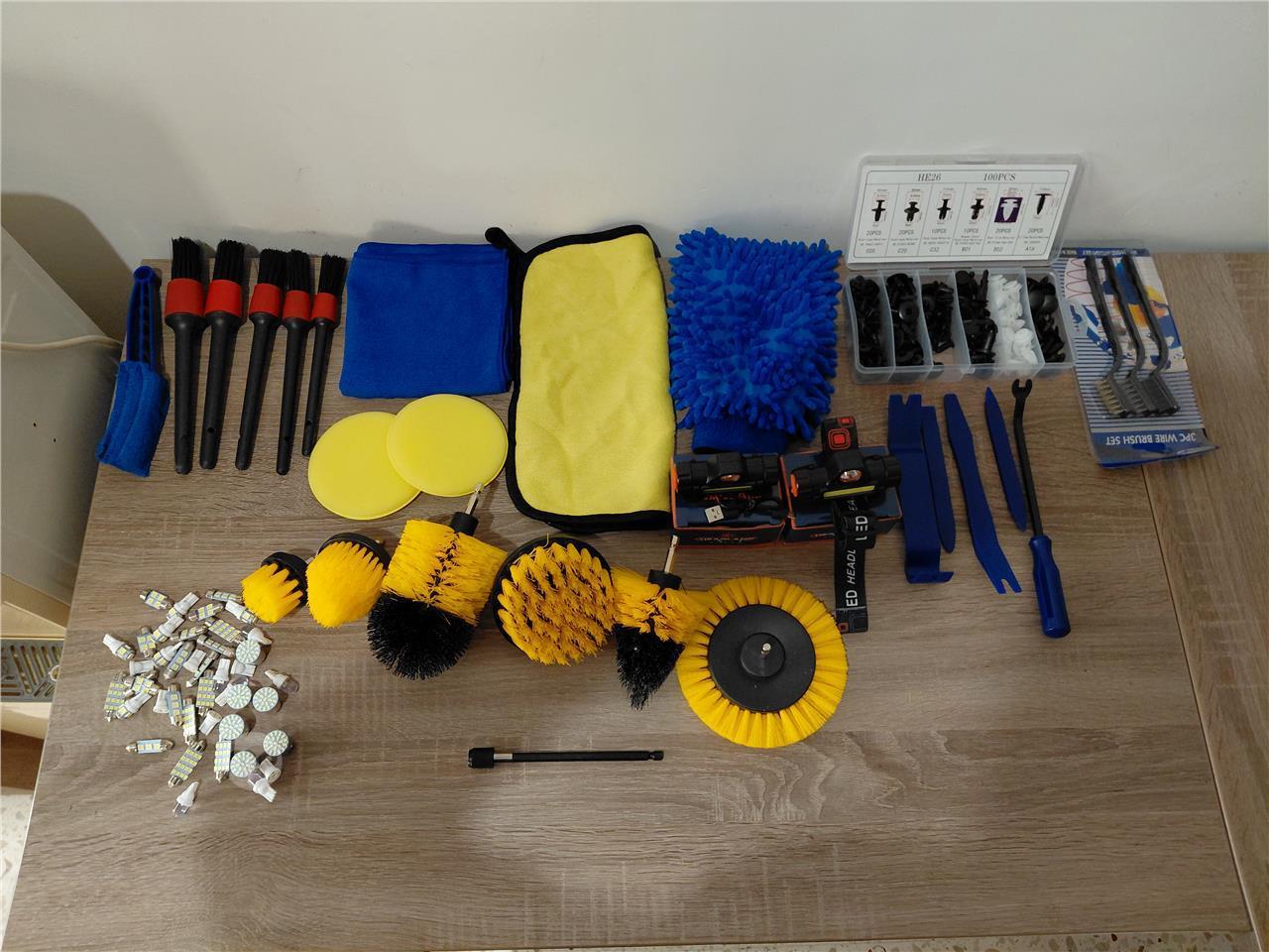 Complete car detailing kit in excellent condition. Includes drill brushes, microfiber towels, polishing pads, trim removal tools, LED bulbs and headlamp. Perfect for car cleaning, detailing or interior work. Selling as full set.