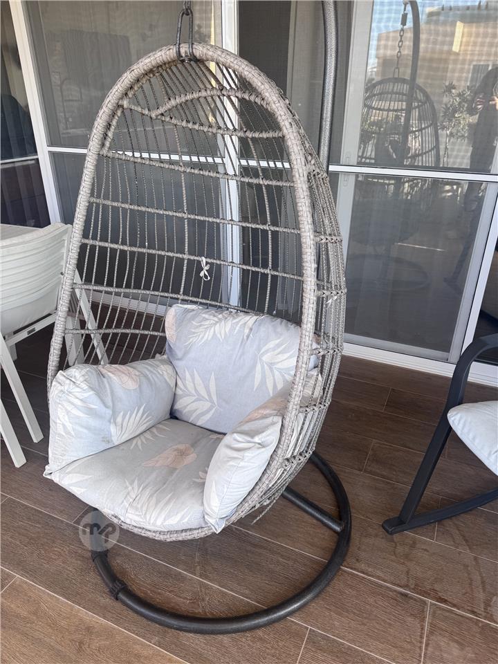 Modern outdoor hanging egg chair in neutral grey wicker with sturdy black metal stand. Includes thick seat and back cushions for comfort. Ideal for balcony, terrace, or garden. Gently used and in good condition.