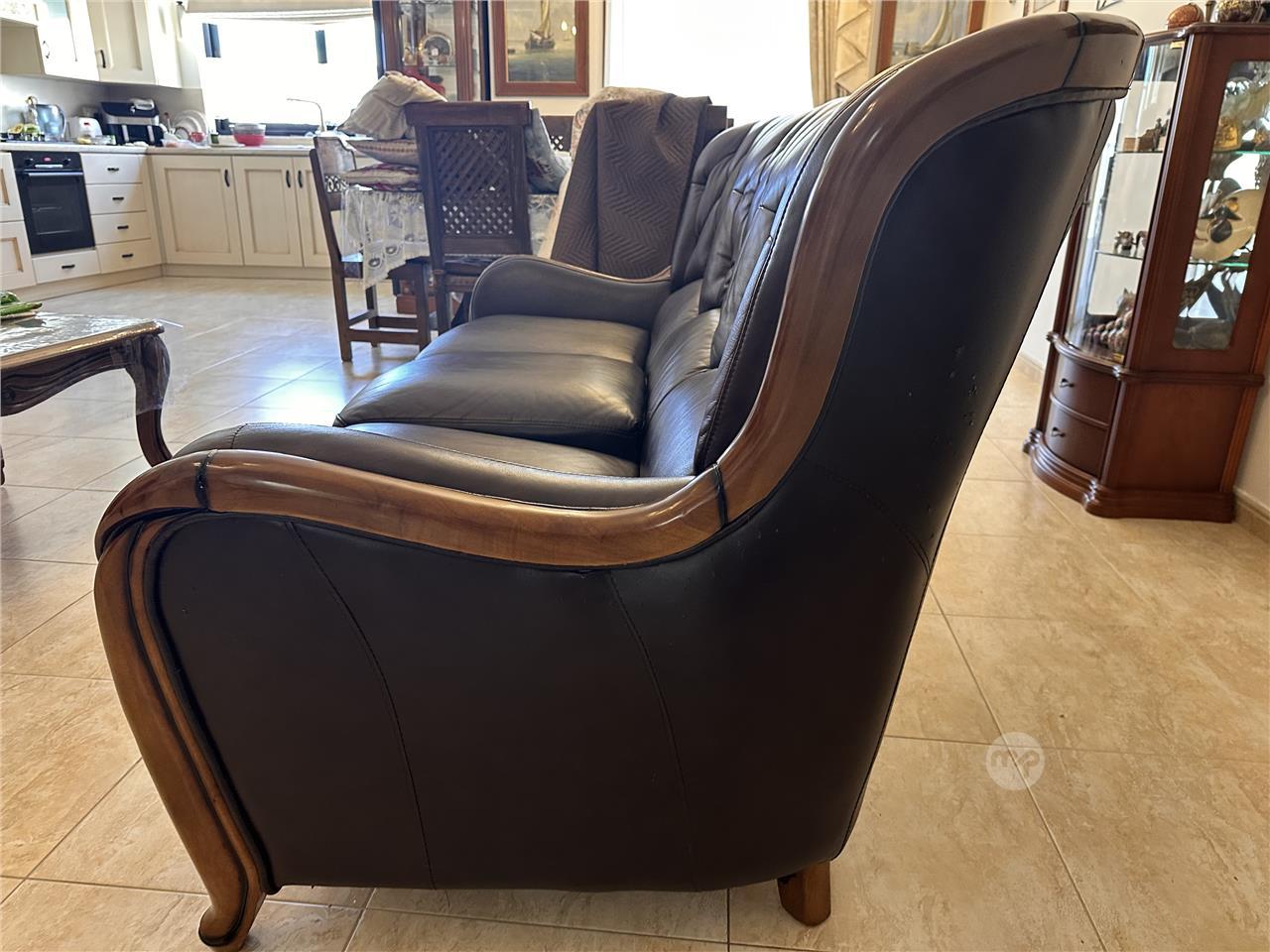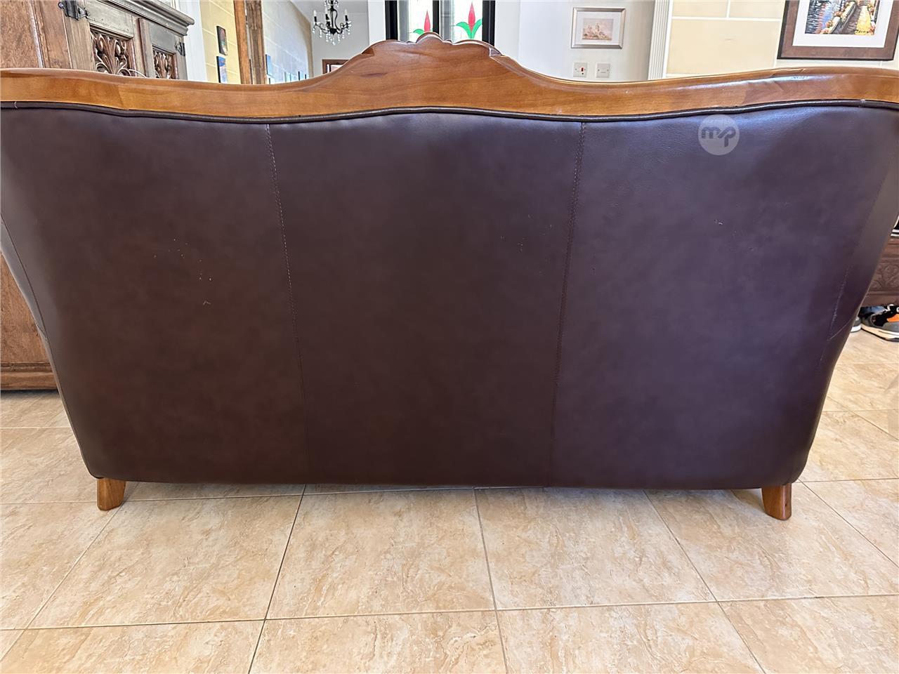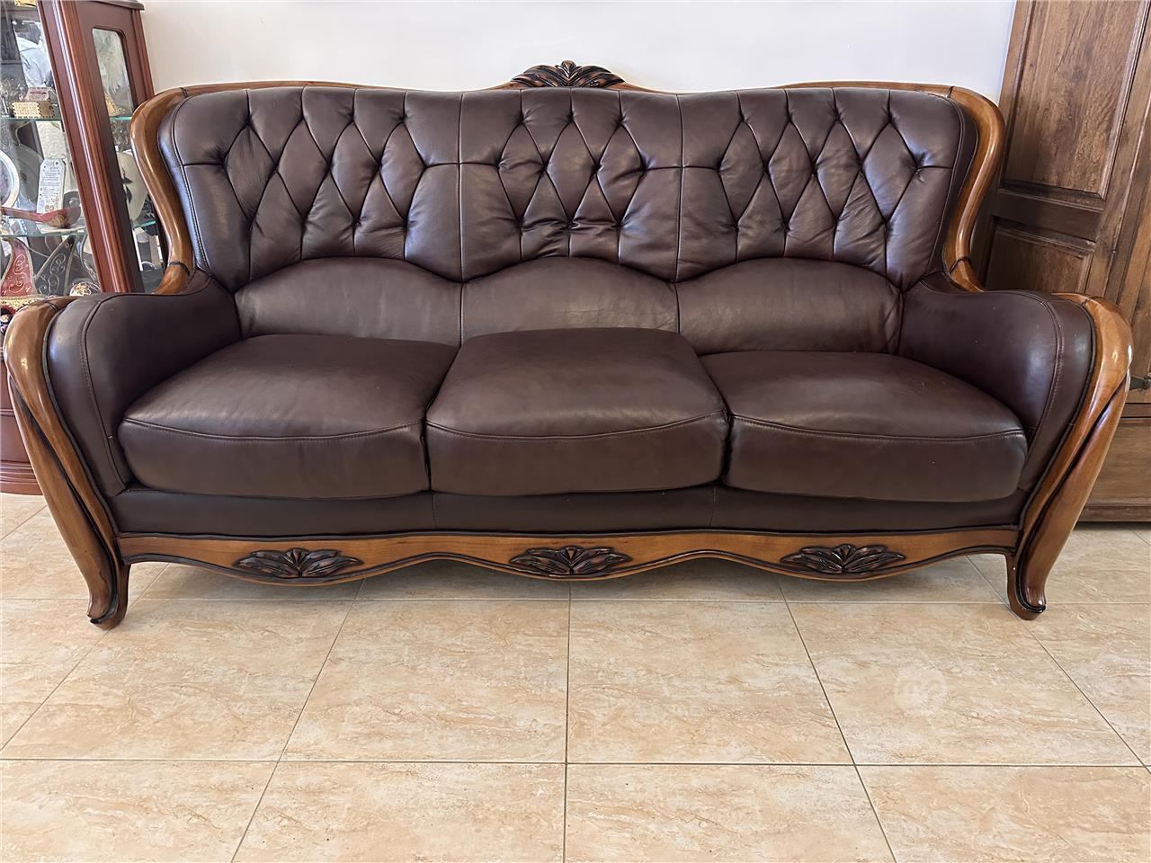 It’s a dark brown non real leather sofa with a high, curved backrest featuring diamond button tufting for a luxurious, timeless look. The frame is made of solid polished wood with beautifully carved details along the front base and top crest. The arms are gently curved with exposed wood trim, giving it a refined, antique-style appearance.
