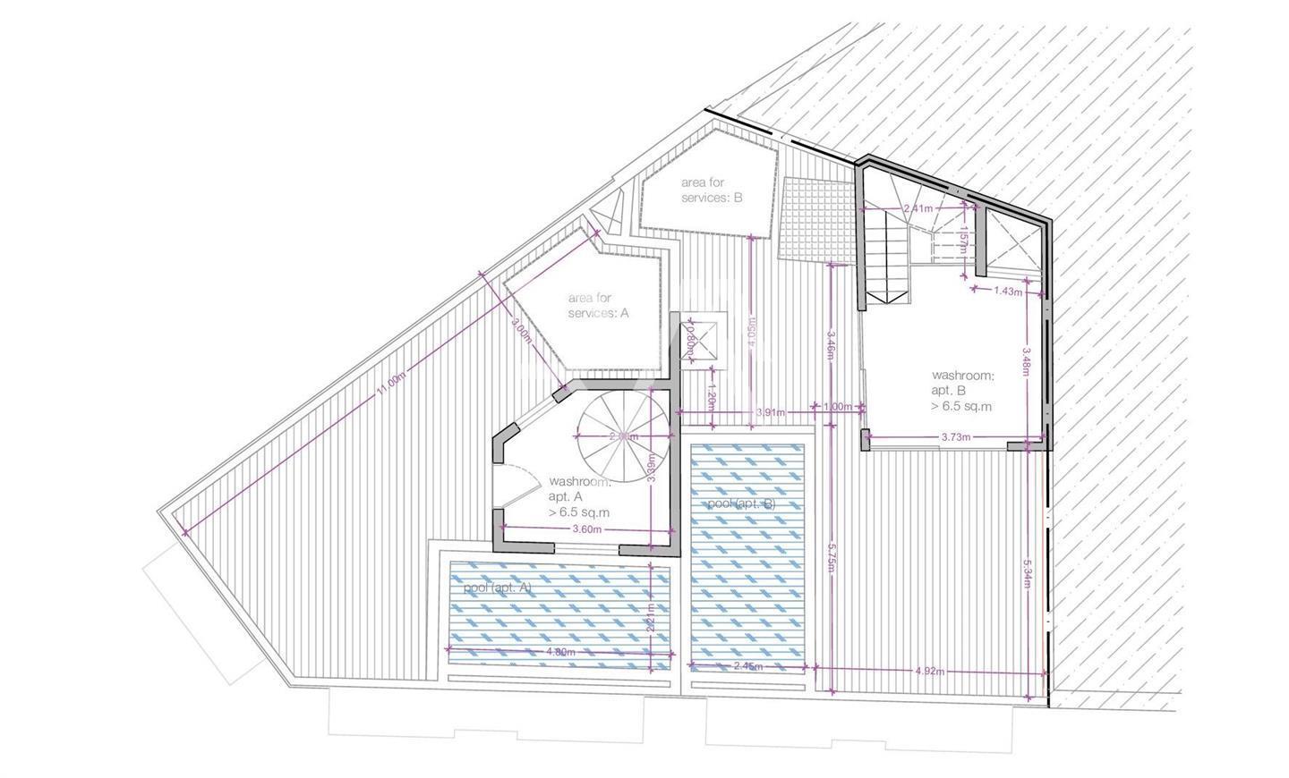 Being sold in advanced shell form, including finished common areas, lift, apertures, and completed roof terrace with pool.