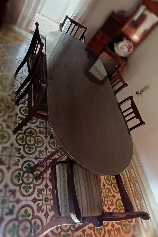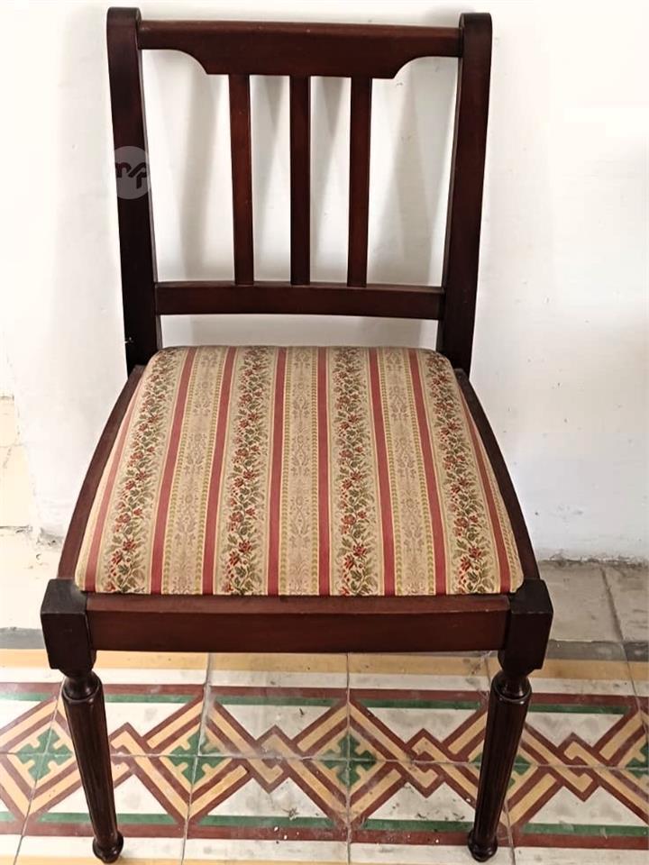 The set includes six matching chairs two arm-chairs and 4 side chairs. All chairs have triple-slat backrest and well maintaned upholstered cushion seating.