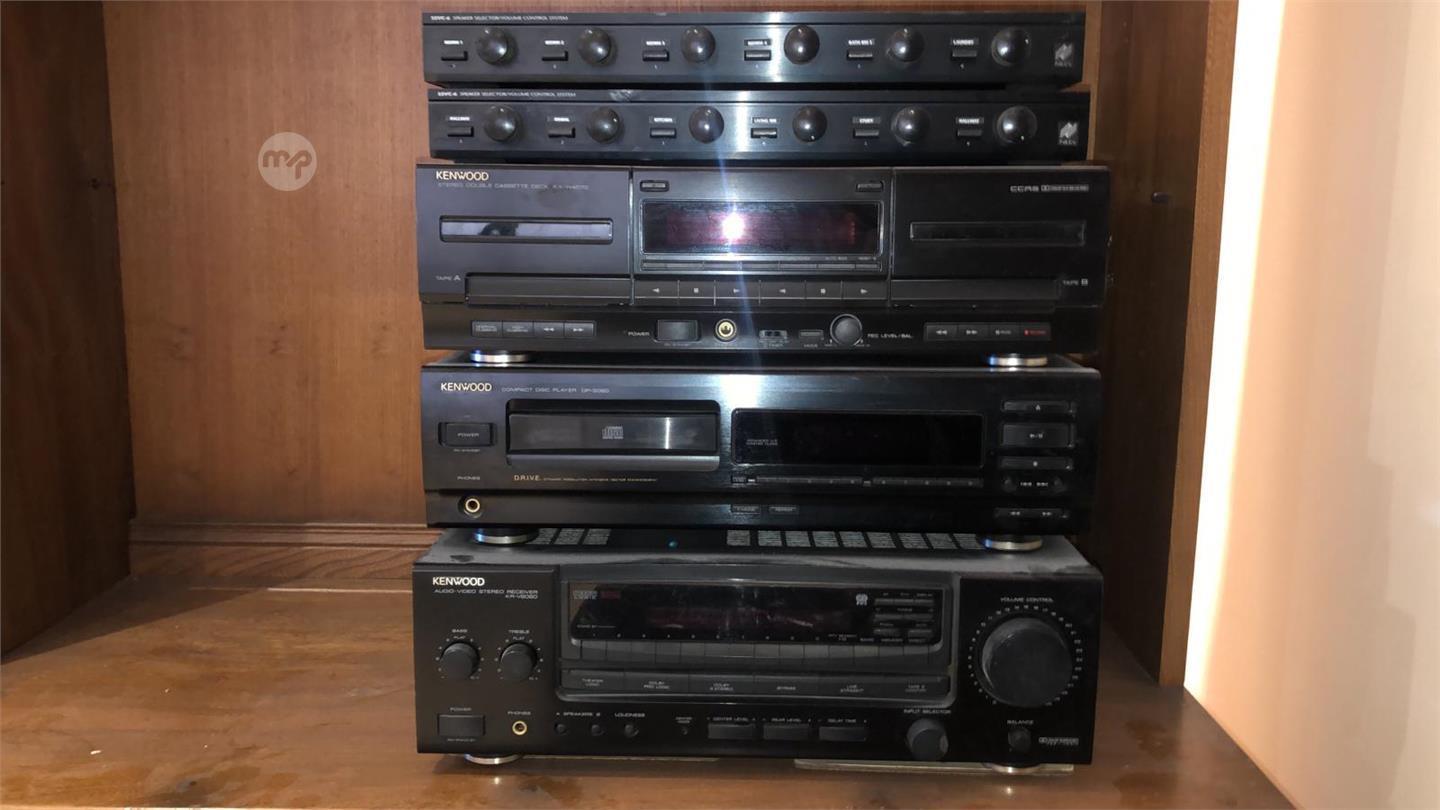 Vintage KENWOOD Audio Components (part of a Home stereo system) with graphic equaliser, double cassette deck, CD Player and an audio/video receiver.