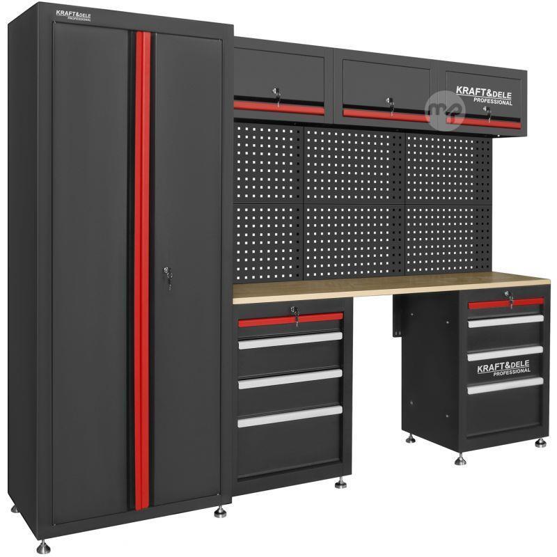 The KD5861 is an extensive set of workshop furniture from KRAFT&DELE, designed for convenient workspace organization in workshops, garages, or technical labs. A comprehensive arrangement of cabinets, shelves, and perforated panels allows for clear and easily accessible organization of tools, accessories, and materials.